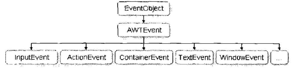 在Swing编程中依然使用AWT的事件处理方式,AWT事件类都放在Java.awt.event包中,而和AWT有关的所有事件类都由AWTEvent类派生。具体事件类的层次如图所示。