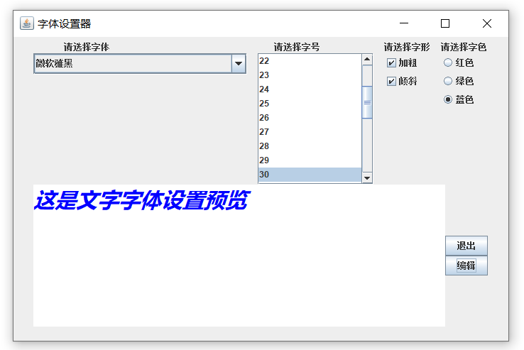 设计一个简单的实现字体设置窗口程序,可根据用户选择设置字体的种类、字号、字形、颜色等属性。