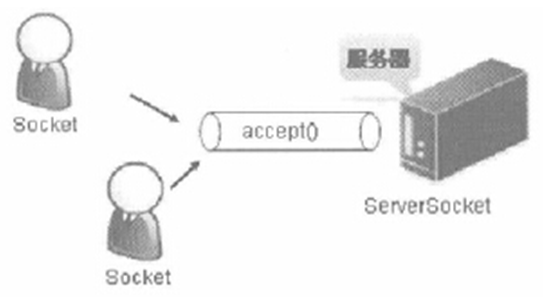 创建一个服务器Socket后,调用方法accept()等待客户的请求。在等待客户请求的过程中,方法accept()将处于阻塞状态(即无限循环状态),直到接收到连接请求后,返回一个用于连接客户端Socket的Socket实例。