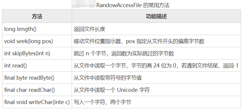 表列出了 RandowAccessFile 类常用的方法及说明。
