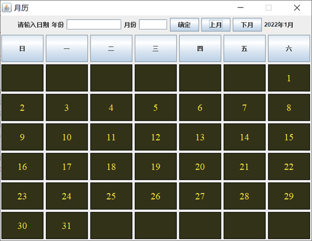参考下图,综合运用GUI编程、事件处理、Calendar类应用等知识设计一款月历,要求能通过输入(或选择)年月方式正确显示当前月份的所有日期。