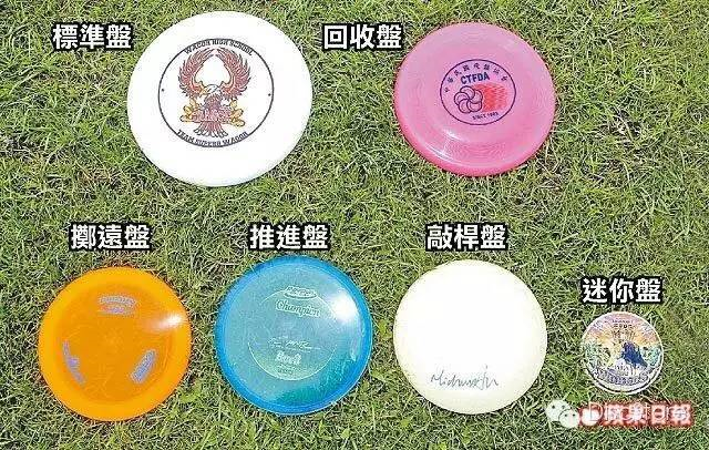 飞盘种类很多,大体而言分为开盘(掷远用)、推进用及敲杆用三种,而这三大类中以开盘及推进盘会因个人的基本条件不同而需慎选择,有了适合自己的飞盘将能轻易克服各种不同洞的困难,高手通常在比赛中携带20片飞盘,而初学者也可仅带一片飞盘就可上场