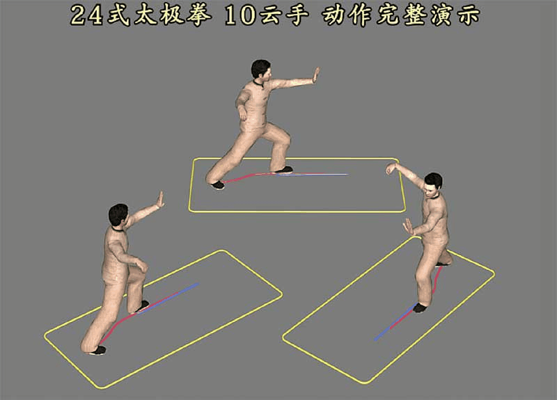 1、 转体摆掌 2、左云并步 3、右云开步 4、左云并步 5、右云开步 6、左云并步