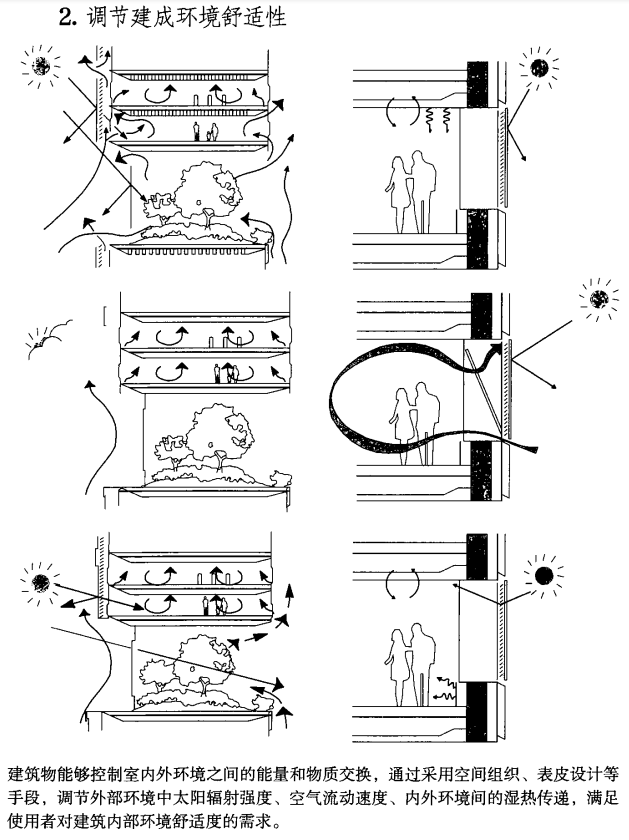 建筑外部环境的每个层面均具有一定的结构。城市环境由不同时期的物质形态叠加而成。每个城市的发展都有独特的结构模式, 城市的各个部分都和这种结构具有一定的关系 , 并依据一定的秩序构成环境。建筑设计应当植根于现存的城市结构体系中 , 尊重城市环境的整体结构特征。地段环境应当是城市环境中的构成单元, 是符合城市自身结构逻辑的、相对独立的空间环境。建筑设计应当尊重城市地段环境的整体框架 , 与已建成的形体环境相配合 , 创造和发展城市环境的整体秩序。场地环境是指由场地 内的建筑物、道路、外部空间、绿化、各种管线工程及其他构筑物等组成 的有机整体。建筑设计的目的就是使场地中各要素尤其是建筑物与其他要素建立新的结构体系 , 并和城市环境、地段环境相关联 , 从而和外部空间各个层面形成有机的整体。