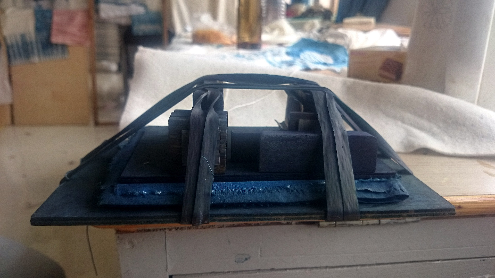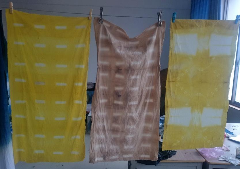 基本原理:夹染最终效果是夹缬在木板内部的区域不会接触染液,完成浸染可留下空白。