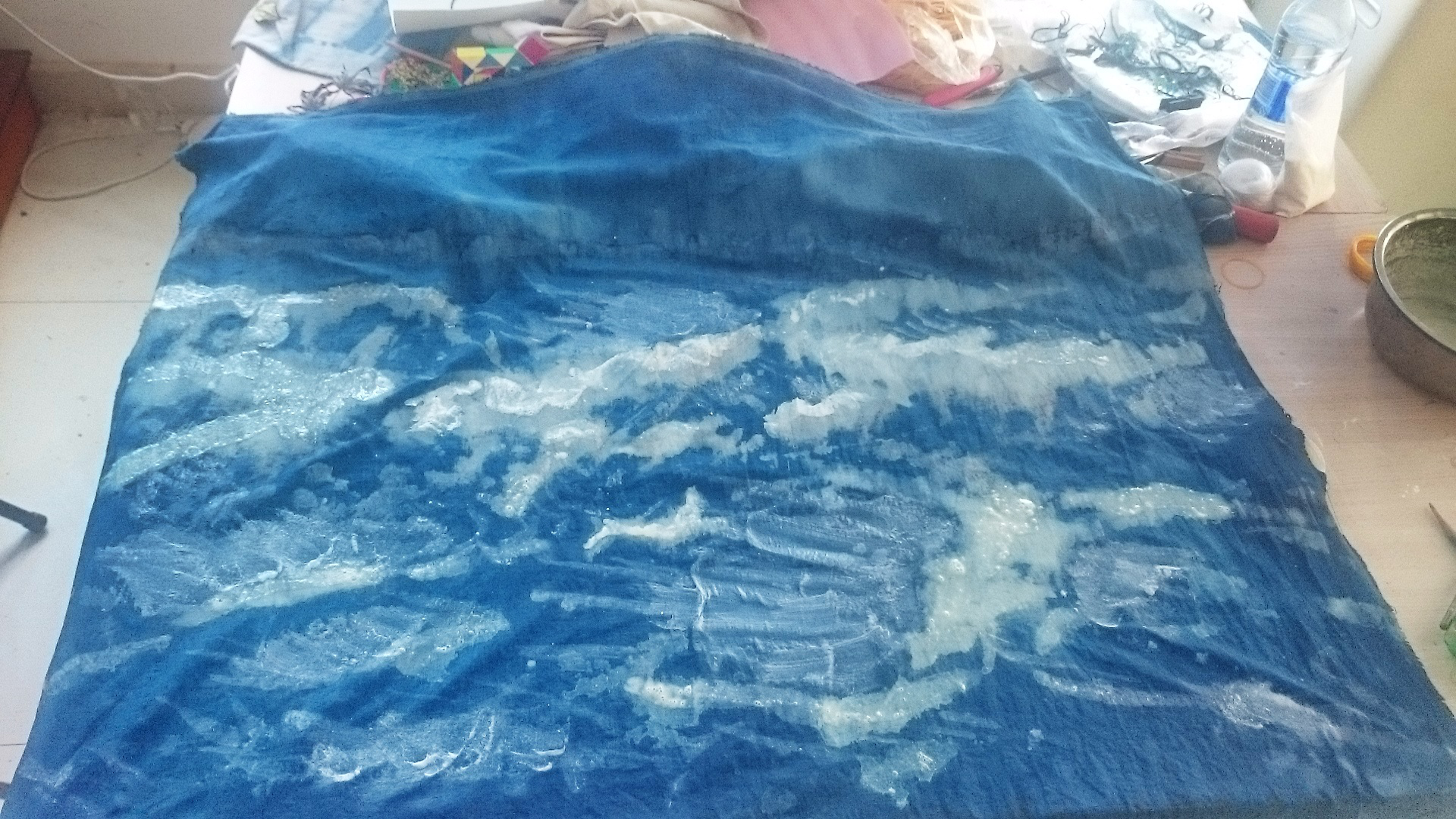 基本原理:蜡染适用于冷染,在染色之前用蜡液封涂于布表面,涂有蜡液的区域会留下布料原本的颜色。