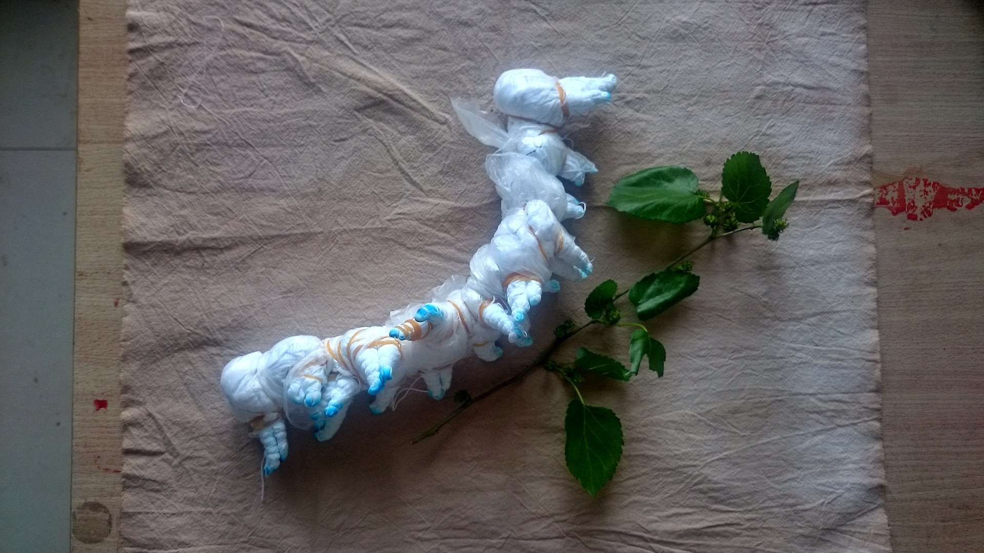 基本原理:绞染着重于表现肌理效果。其创作原理是将布附着于管状物品,后挤压做出褶皱。(像挽起袖管)褶皱内层不会上色,从而生成奇妙富于变化的纹样。