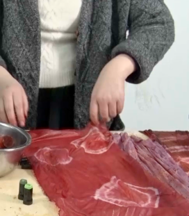 扎染:扎染是植物染中普遍使用的技法,其原理用线对布料做捆扎处理,经过上色后被捆扎的部分不会着色 在局部留下布料原本的色彩。这一手段便于掌握,且极富变幻。