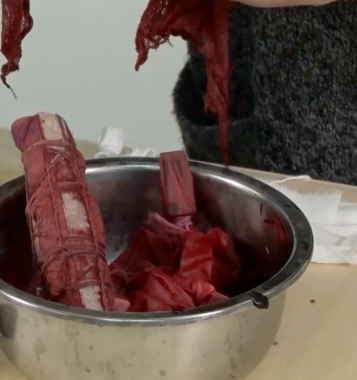 扎染工艺分为扎结和染色两部分。它是通过纱、线、绳等工具,对织物进行扎、缝、缚、缀、夹等多种形式组合后进行染色。