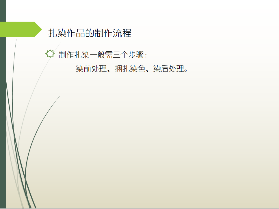 另外,丝绸的染前处理是用皂液加碳酸钠加水煮精炼。 熨平待用:用电熨斗将漂洗过的布熨平以备描绘图案及捆扎用。