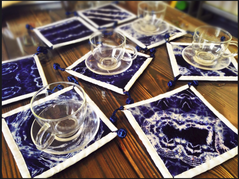过程:将布夹在两个小铁块中间,用夹子加紧,之后就可以放入草木染缸中,采用蓝靛离的染布方法染半小时。
