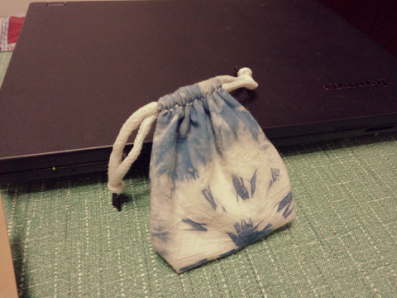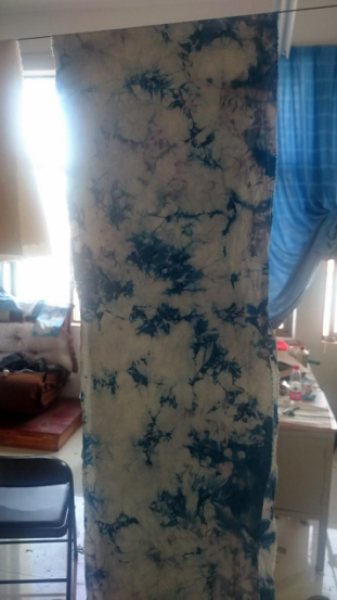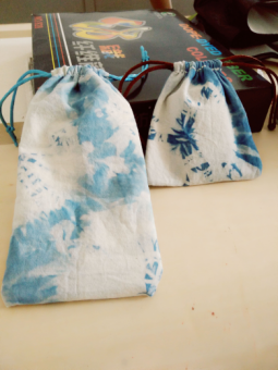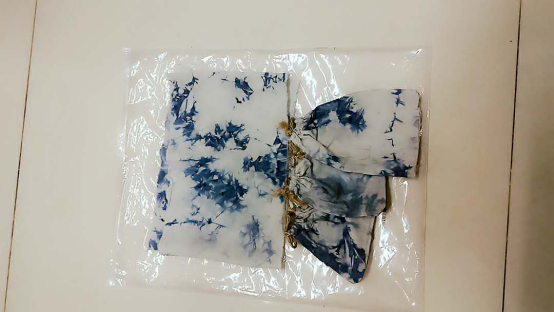 下一步需要按照设计好的尺寸裁剪成合适的布块。下图是扎染中的一种叫做云染的技法做出的纹理。经过裁切,用针线收边可制成小手袋。
