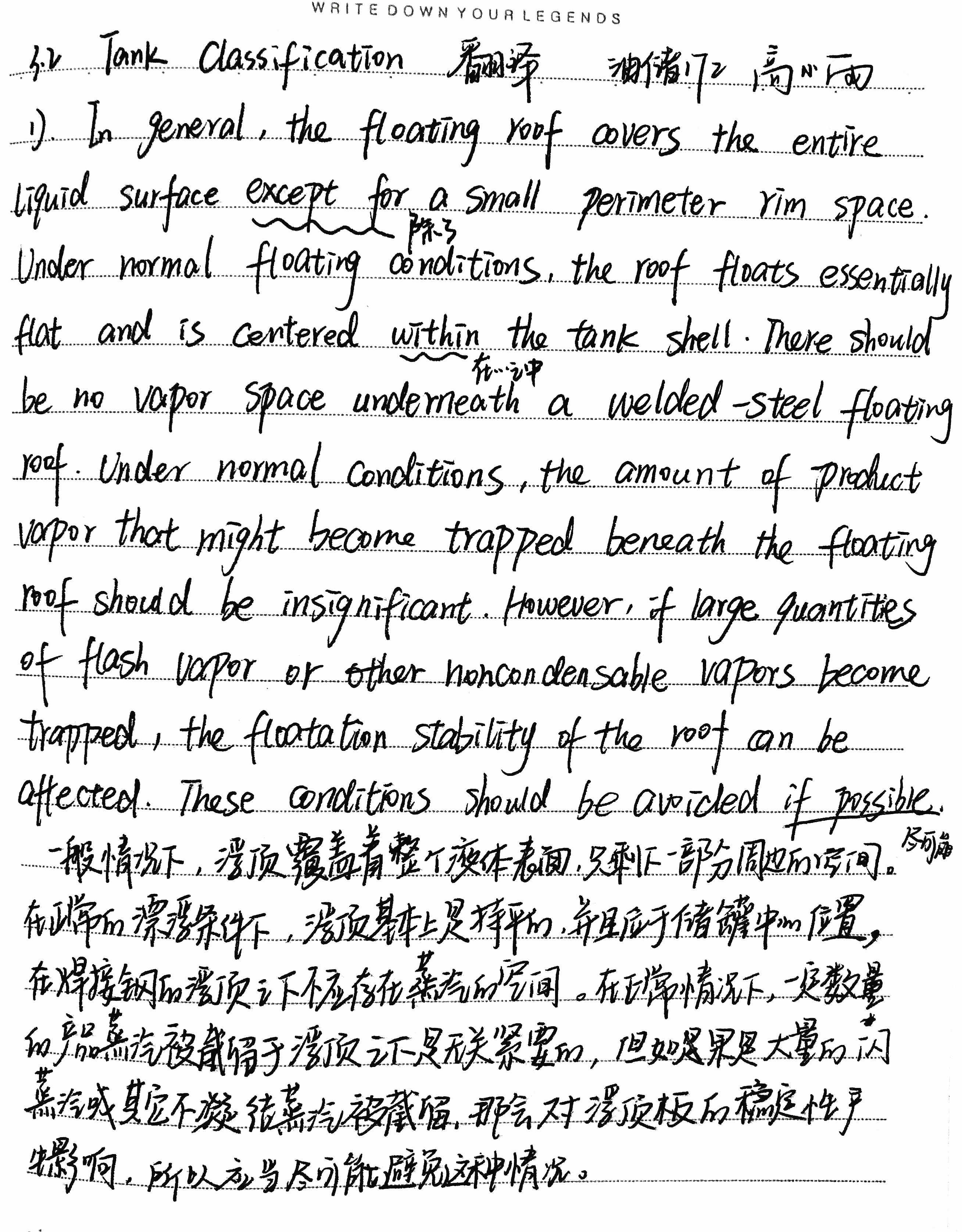 1) In general, the floating roof covers the entire liquid surface except for a small perimeter rim space. Under normal floating conditions, the roof floats essentially flat and is centered within the tank shell. There should be no vapor space underneath a welded-steel floating roof. Under normal conditions, the amount of product vapor that might become trapped beneath the floating roof should be insignificant. However, if large quantities of flash vapor or other noncondensable vapors become trapped, the floatation stability of the roof can be affected. These conditions should be avoided if possible.