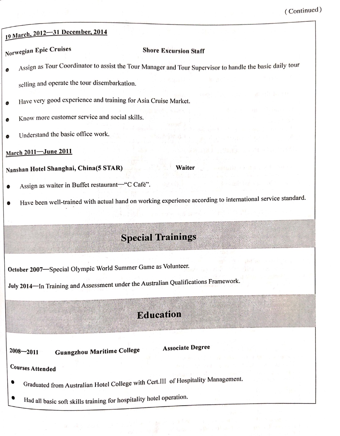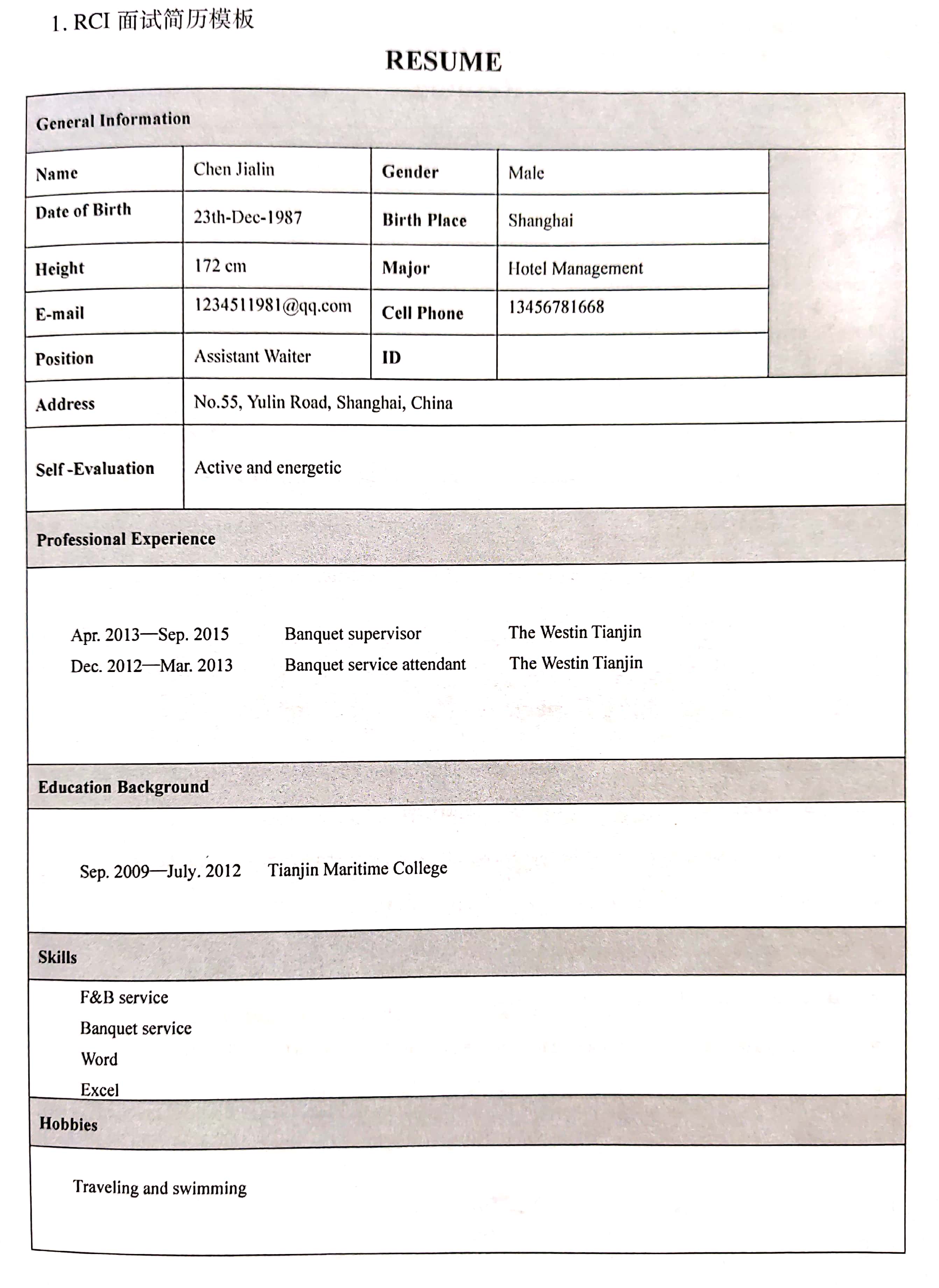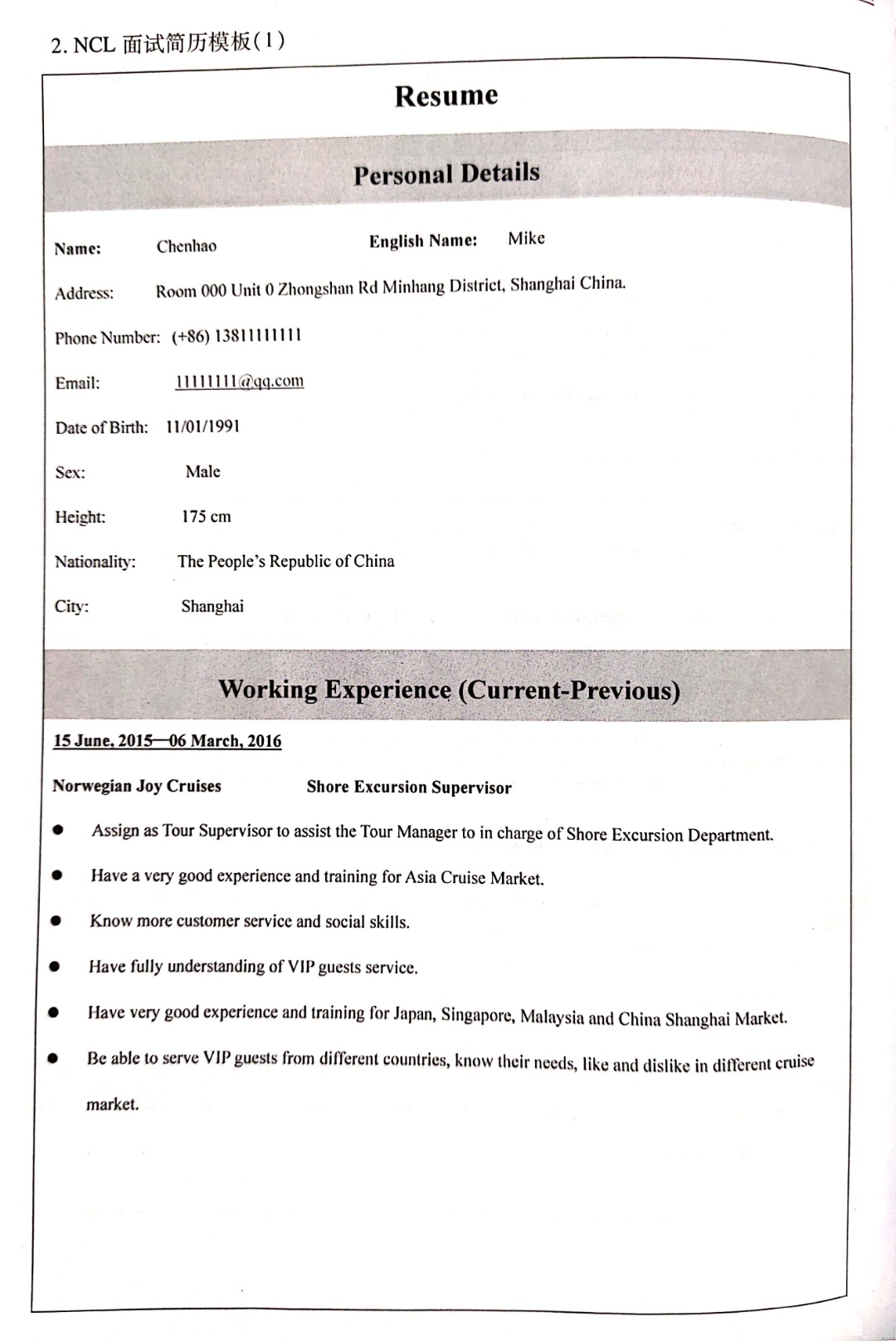 正如上文所提,不同邮轮公司可能有不同的简历模板,接下来咱们以两个公司的为例