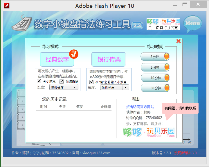 大家下载上面这个练习软件:小键盘练习工具V2.3.exe。这个软件免安装,打开直接使用。双击此软件,进入这个界面。经典数字下面有小数点和加减乘除都要勾选。勾选之后变成下面这个界面。