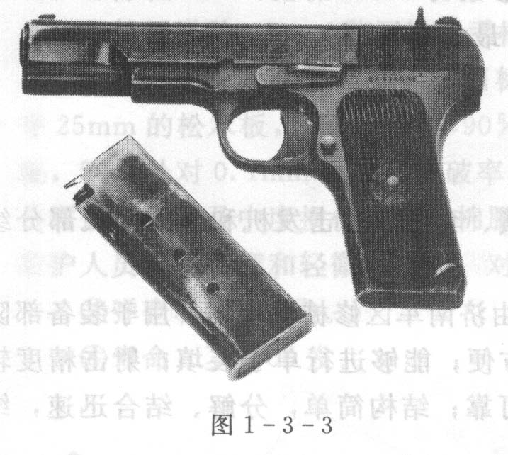 54式7.62mm手枪系仿制苏联TT-33式7.62mm手枪,我国于1954年定型生产,曾是我国军队和警察的制式手枪。该枪结构简单、使用方便,瞄准基线长、射击精度好,威力大、示警效果好,见图1-3-3。