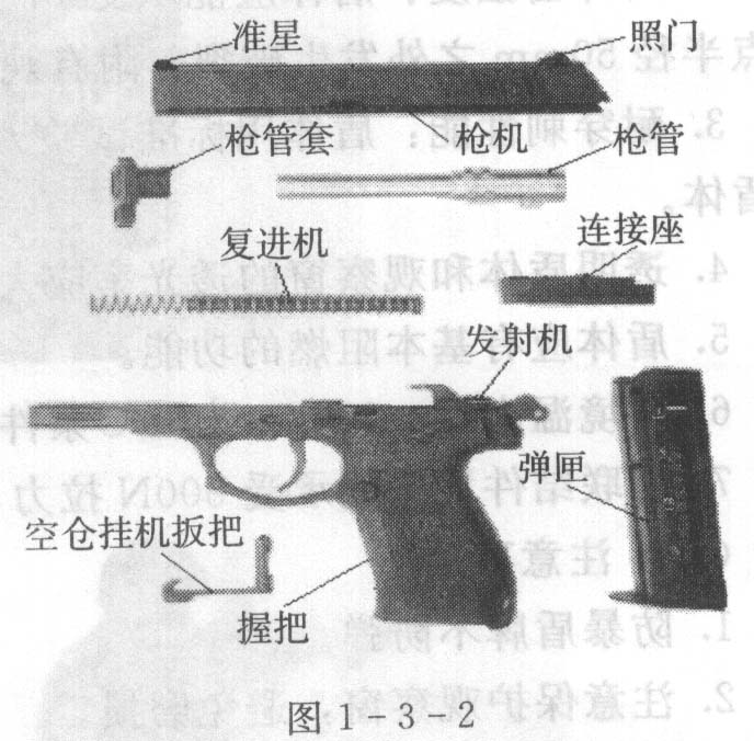 (2)结构。92式手枪主要由握把、枪机、枪管、枪管套、复进机、连接座、发射机、弹匣、瞄准具及空仓挂机扳把等几大部件组成,见图1一3-2。