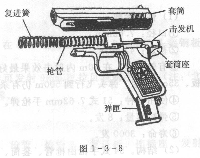 (2)结构。77式手枪由枪管、套筒、复进簧、套筒座、击发机和弹匣六大部分组成,见图1-3-8。另外还配有一套附品。