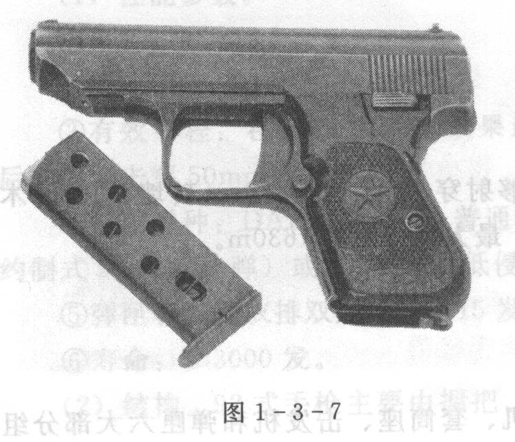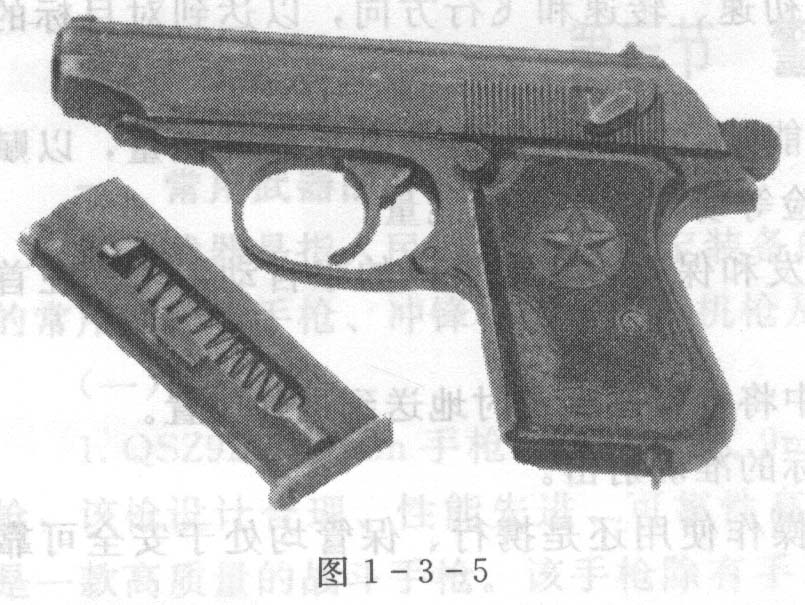 64式7.62mm手枪,是我国自行设计制造的武器,具有体积小、重量轻、便于隐蔽携带的特点,该枪射击精度较好,设有空仓挂机和弹匣回机,膛内枪弹显示器,可联动击发,见图1-3-5。