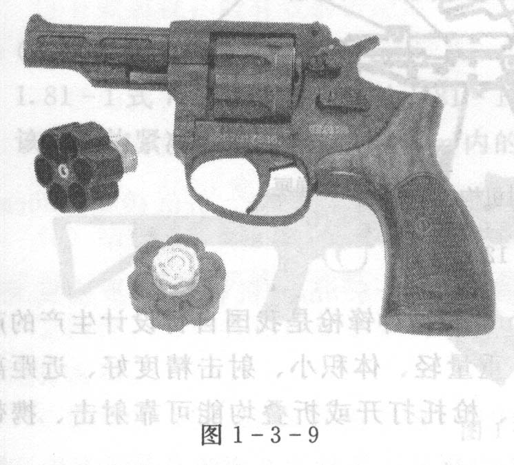 2005式9mm警用转轮手枪是公安部首次独立组织力量开发的低杀伤和非致命杀伤新型自卫、防暴武器系统。主要用于制服50m内的犯罪嫌疑人和犯罪分子;驱散50m内非法聚集闹事人群;对50m内有生目标有杀伤作用。该枪采用六发转轮供弹,可实现快速联动射击,体积小,故障率低,射击密集度高,保险手段完备,安全性好,见图1-3-9。