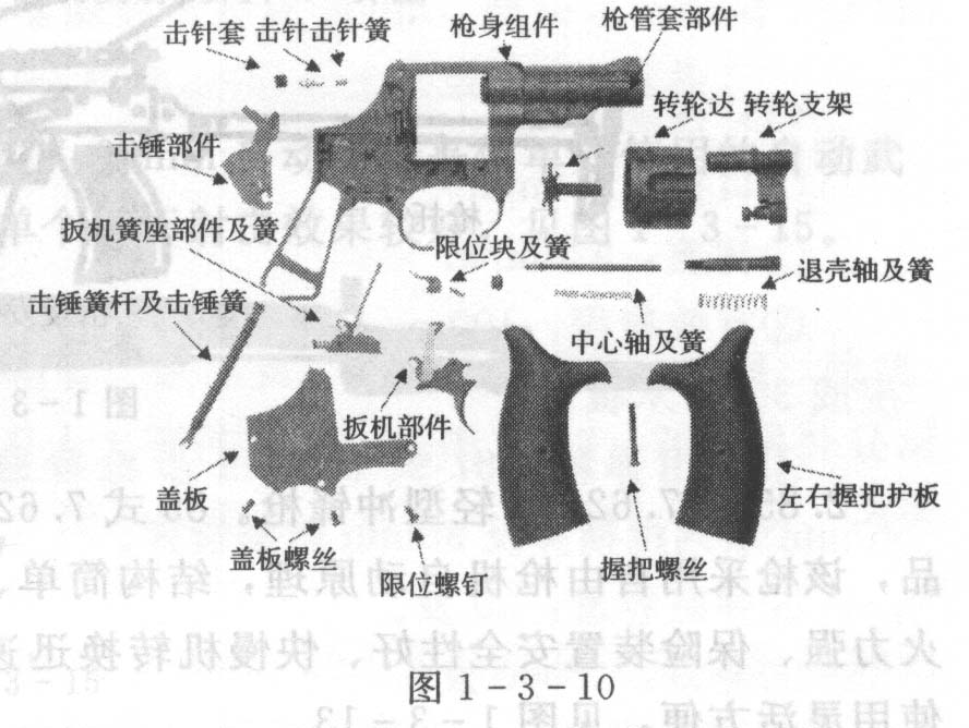 (2)结构。转轮手枪主要机件有枪管、转轮、握把护板、盖板部件、击发机等,见图1-3-10。另外还配有一套附品。
