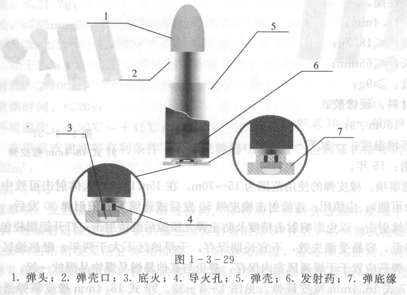 枪弹是由弹头、弹壳、底火和发射药等组成。弹头用于摧毁、杀伤目标;弹壳用于容纳发射药,安装弹头和底火;底火用于点燃发射药;发射药用于燃烧后,产生火药气体,推动弹头前进,见图1-3-29。