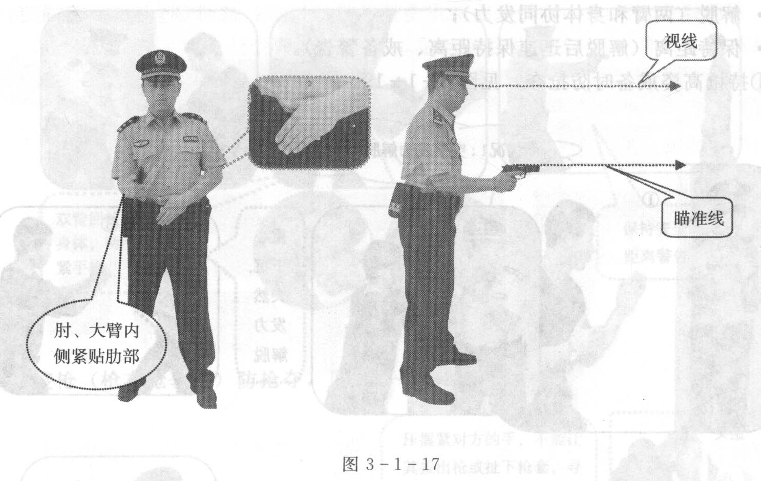 5、单手腹前戒备,见图3-1-17。适合于出枪后的各种准备状态时运用,它是训练中射击前的预备姿势和射击后的待命姿势。
