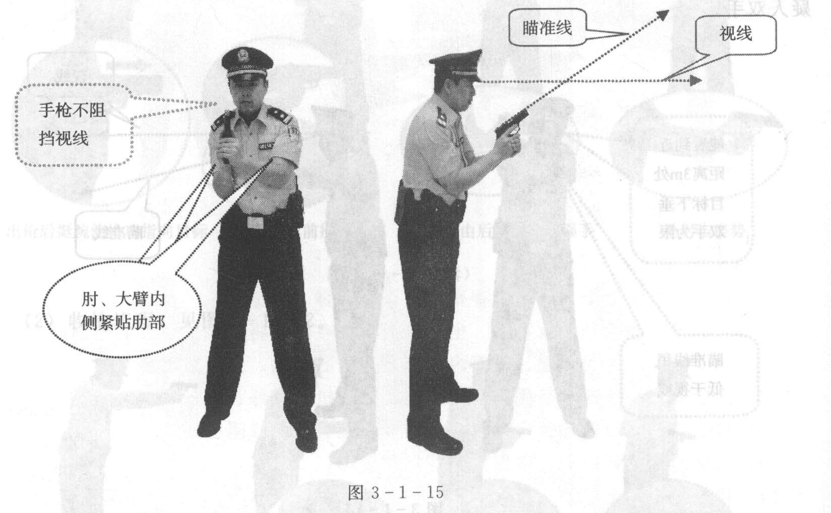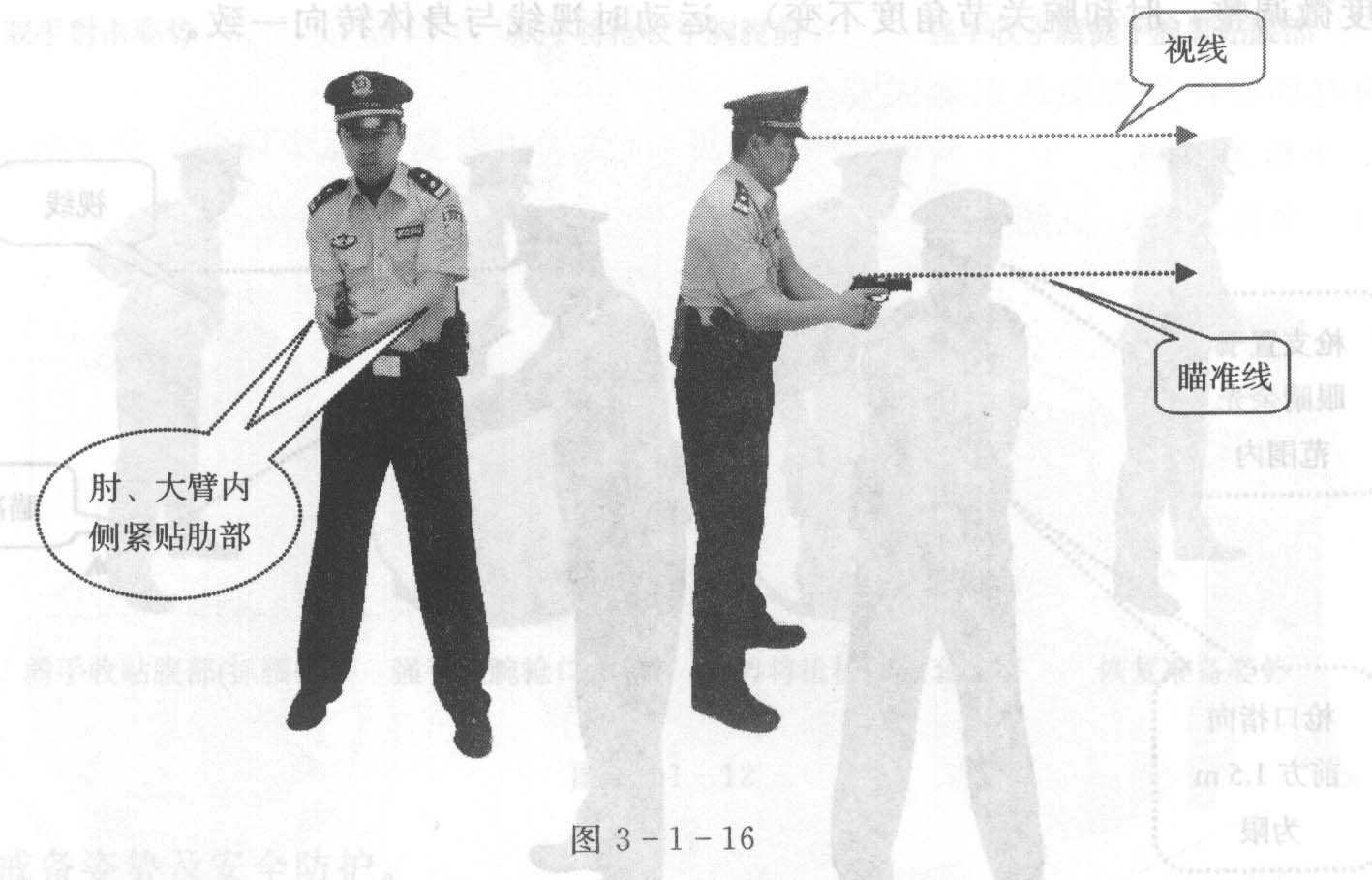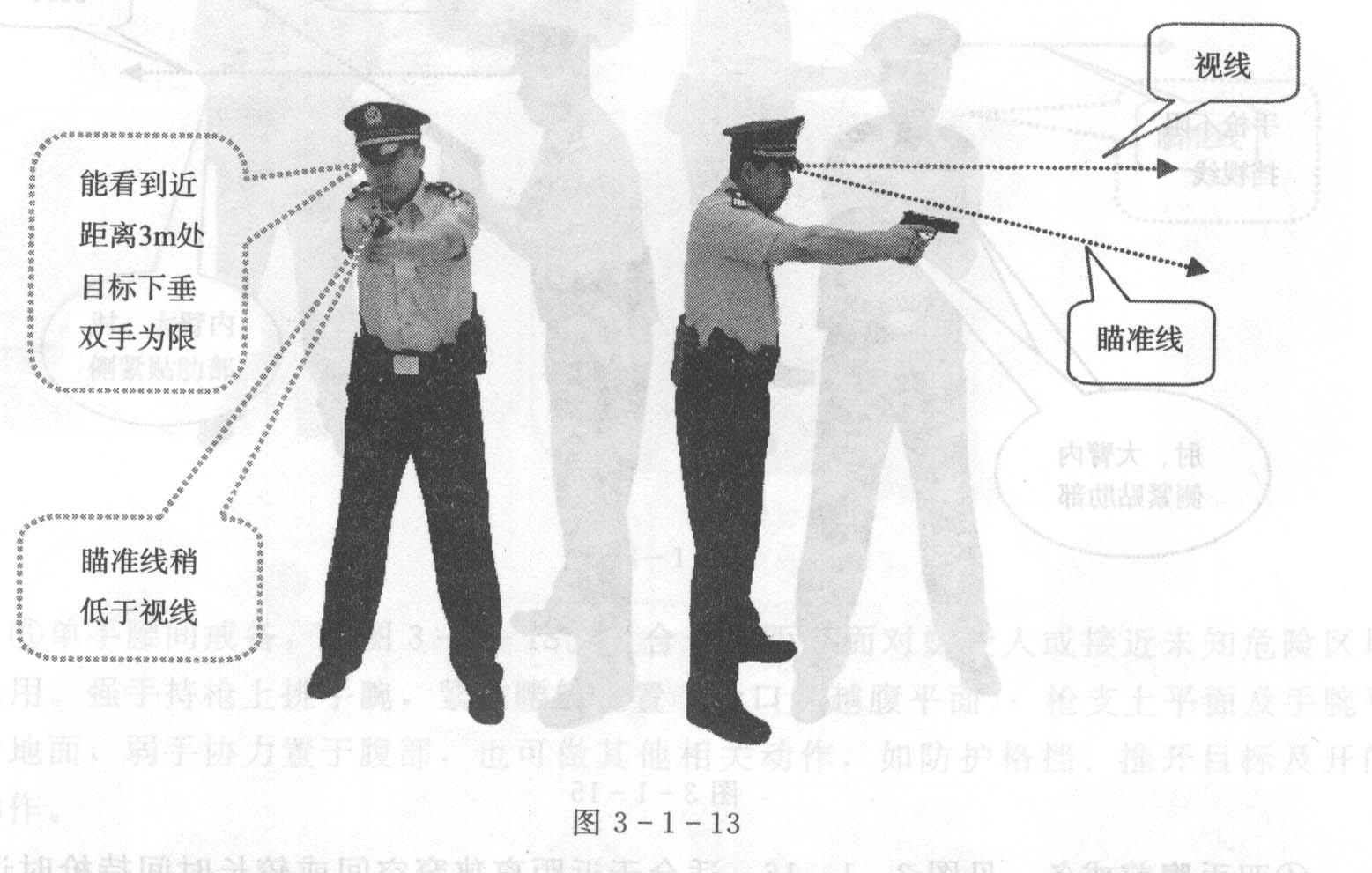 1、平肩戒备,见图3-1-13。适合在危险情况下运用。双手持枪向前保持与肩水平稍向下位置,不阻碍视线,需要时可迅速抬臂提升瞄线到射击水平位置(肩关节角度微调整,肘和腕关节角度不变)。运动时视线与身体转向一致,并时刻留意近距离嫌疑人双手。