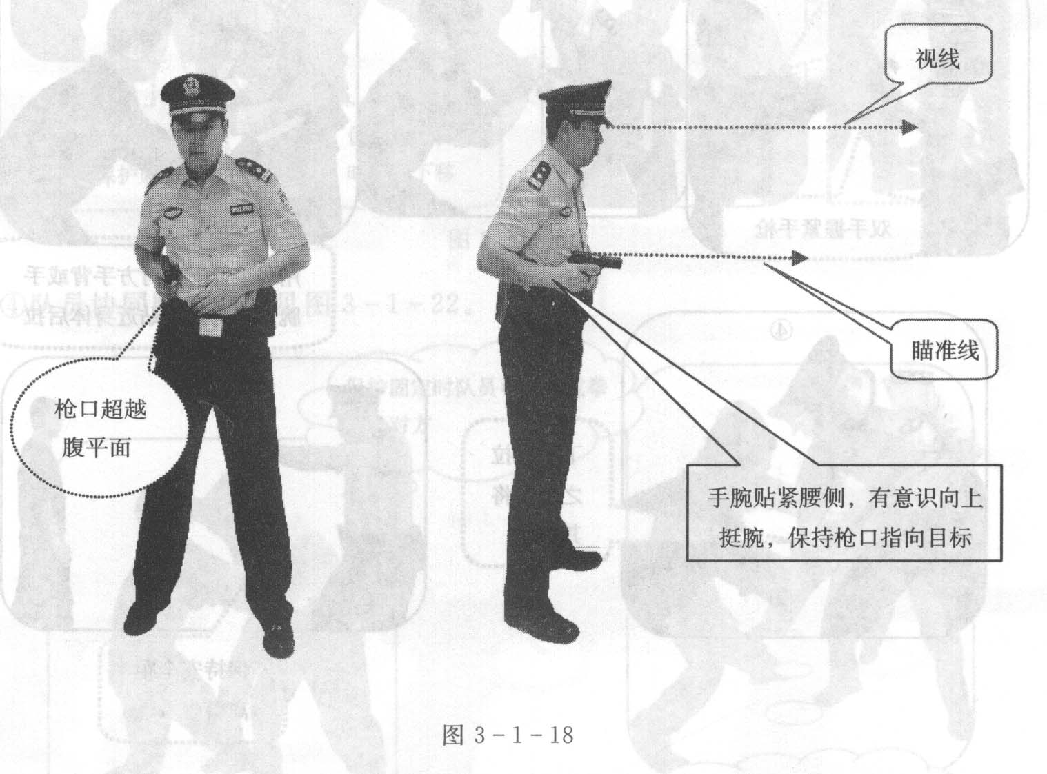6、单手腰间戒备,见图3-1-18。适合于近距离面对嫌疑人或接近未知危险区域时运用。强手持枪上挑手腕,紧贴腰侧位置(枪口超越腹平面);枪支上平面及手腕平行于地面,弱手协力置于腹部,也可做其他相关动作,如防护格挡、推开目标及开门等动作。
