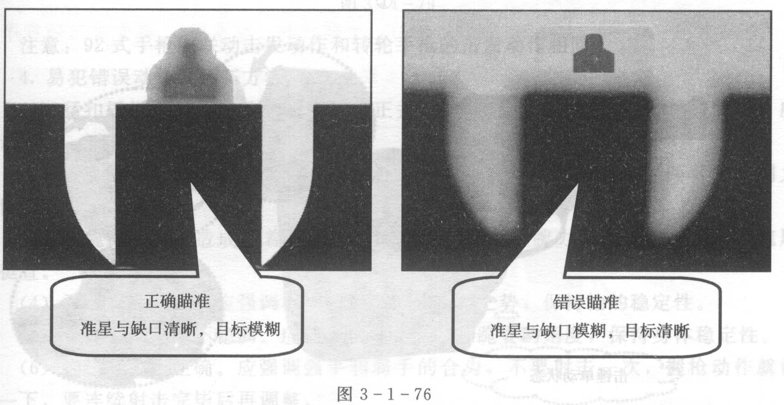 正确的瞄准动作是应通视缺口与准星,使准星尖位于缺口中央,并与上沿平齐构成平正关系指向瞄准区。正确的瞄准是,准星与缺口构成的平正关系要看得清楚,而目标则看得模糊,见图3-1-76。