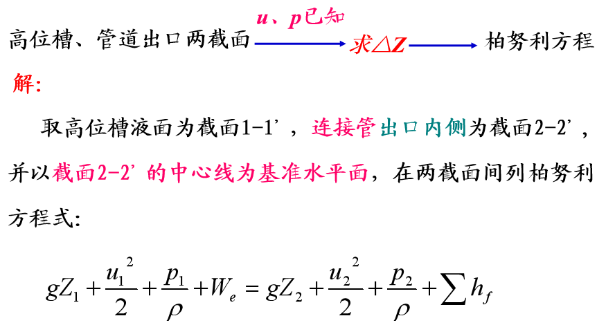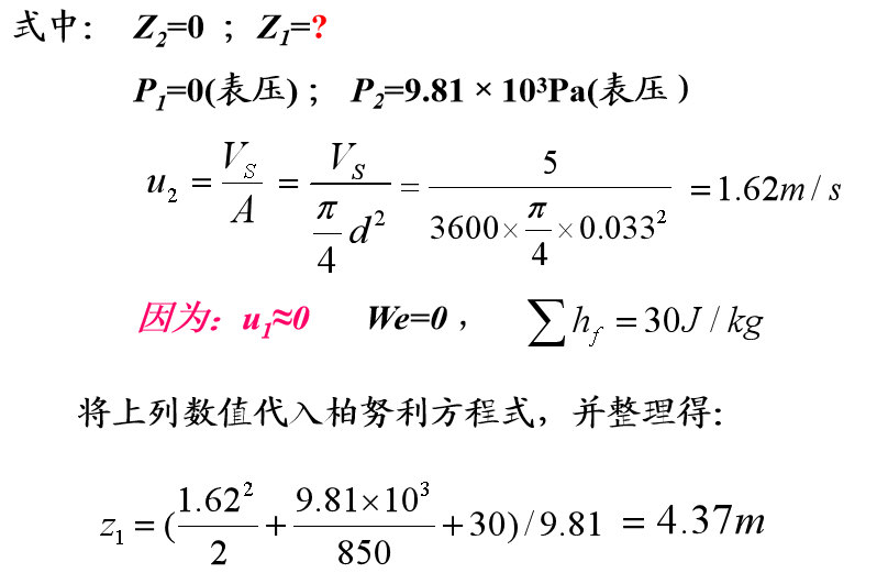 例1:如本题附图所示,密度为850kg/m3的料液高位槽送入塔中,高位槽中的液面维持恒定,塔内表压强为9.81×103Pa,进料量为5m3/h,连接管直径为φ38×2.5mm,料液在连接管内流动时的能量损失为30J/kg(不包括出口的能量损失),试求:高位槽内液面应为比塔内的进料口高出多少?