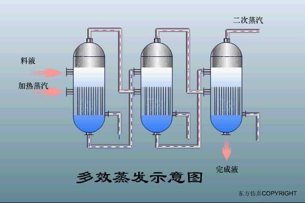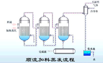 如此将多个蒸发器串联起来一同操作的过程,组成了多效蒸发操作流程。多效蒸发操作蒸汽与物料的流向有并流、逆流、错流、平流几种组合,其具有降低能耗、便于分离晶体、强化传热过程和提高蒸发效率等优点。当蒸发水分量相同时,多效蒸发所需加热蒸汽消耗量比单效明显减少,因而提高了加热蒸汽的利用率,即经济性。因此在蒸发大量水分时,应采用多效。