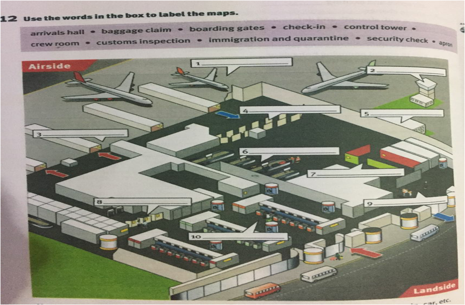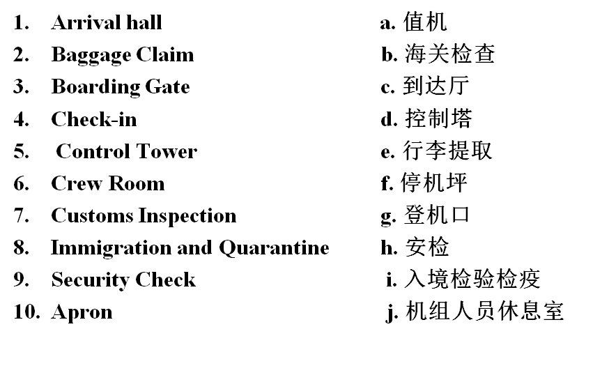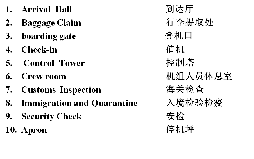 arrival hall // baggage claim // boarding gate// check-in // control tower//crew room // custom inspection // immigration and quarantine// security check // apron