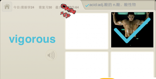 点击认为合适的图片,如果与单词配对则会出现一个蓝色的勾并发出“唰”的一声。之后就进入该单词的详细解读界面。