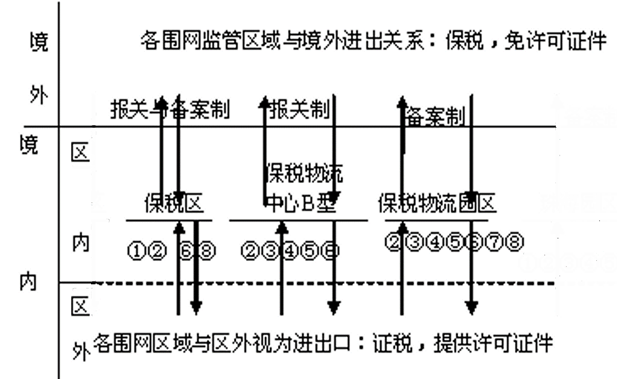 | 与境外进出物流中心内的货物予以保税,不实行进出口配额、许可证件管理;与境内区外进出口货物视同进出口,征税,须提交许可证件 | |||