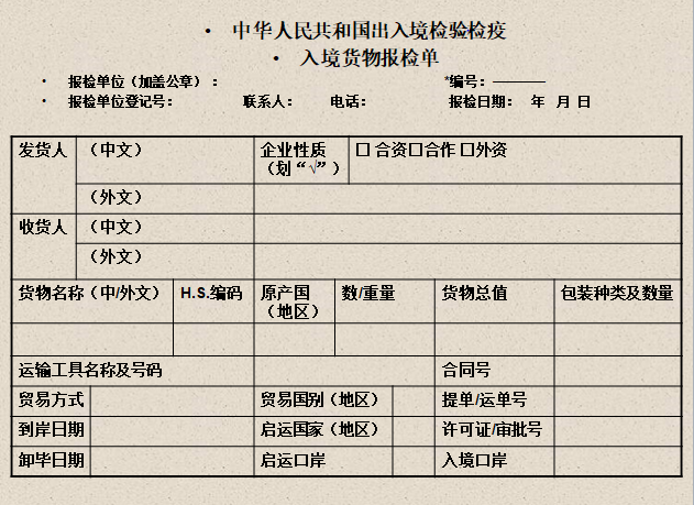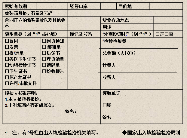 2、报检单必须按所申报的货物内容填写。填写内容与随附单据相符,填写必须完整、准确,不得涂改,对无法填写或无此内容的栏目,统一填写“***”