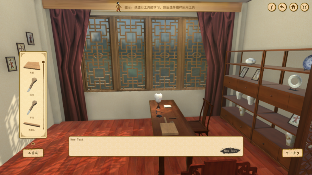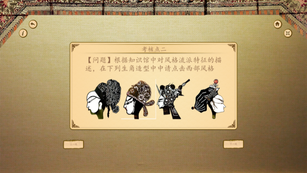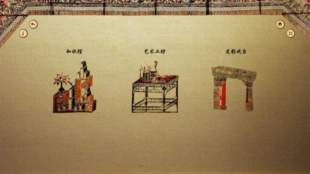 步骤2:点击“知识馆”,进行民间皮影的历史起源、艺术风格、造型规律等理论知识的学习。