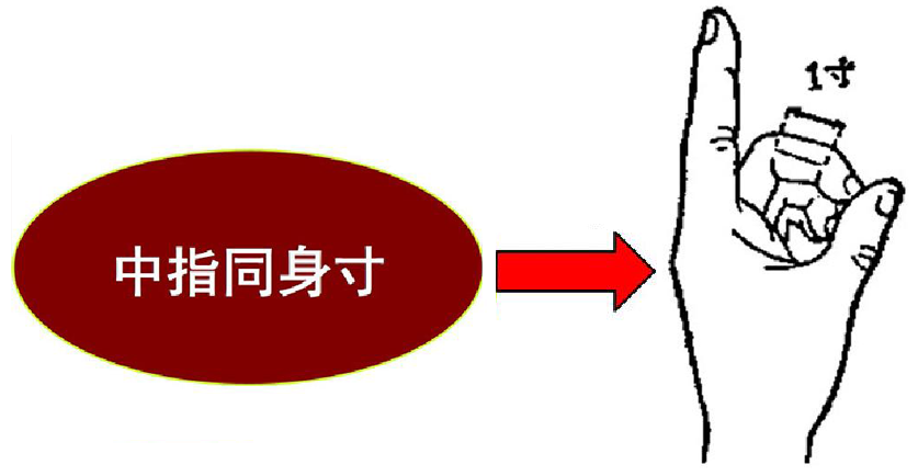 中指同身寸,即以患者的中指屈曲时,中节内侧两端纹头之间作为1寸。这种方法适用于四肢及脊背作横寸折算。