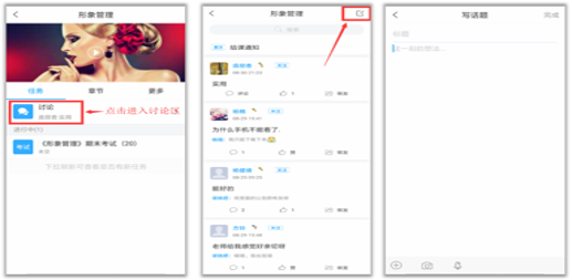 在“任务”栏,点击“讨论”,即可进入课程讨论区。在讨论区点击右上方的编辑按钮,编辑话题,就可以和老师、同学们一起交流分享自己的学习心得啦。