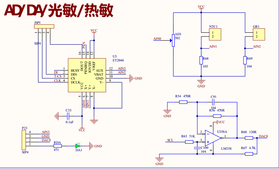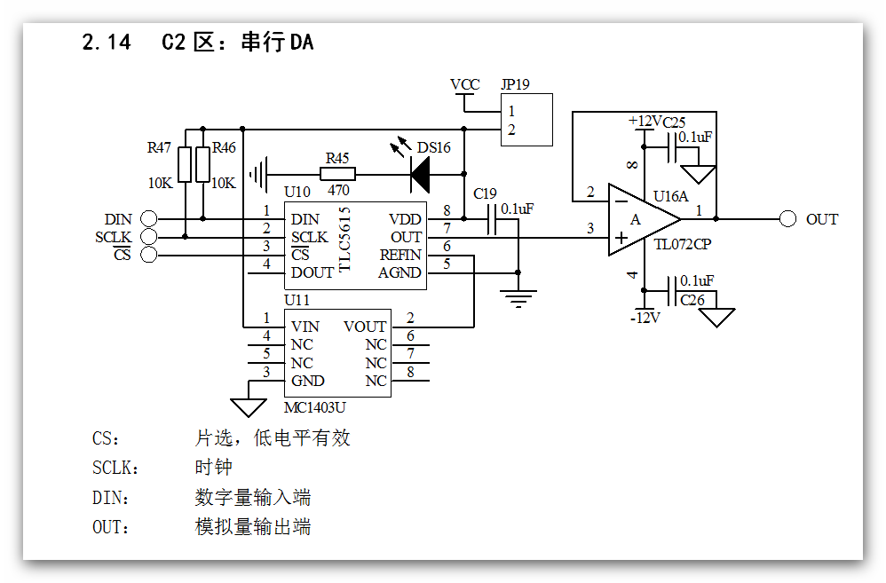 17. 串行DA,MC1403U提供基准电压,数字量从DIN在SCLK脉冲配合下输入 最后的TL072CP是电压跟随器,电压结果输出在OUT