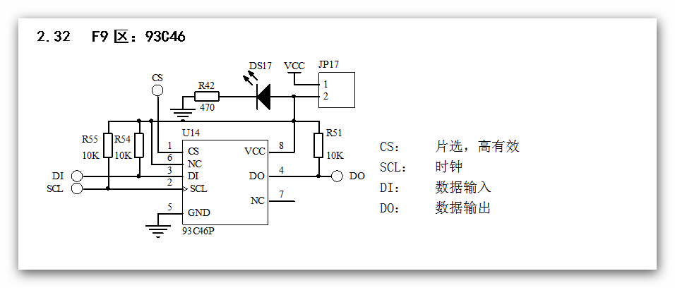 19. 93C46 --EEPROM存储器,10K电阻稳定电平,DI信号在SC信号配合下,将输入串行输入,输出数据在DO端, 存储64个16位的数据,这个就是SPI借口。不过比如EEPROM 芯片,如24C08用的比较多