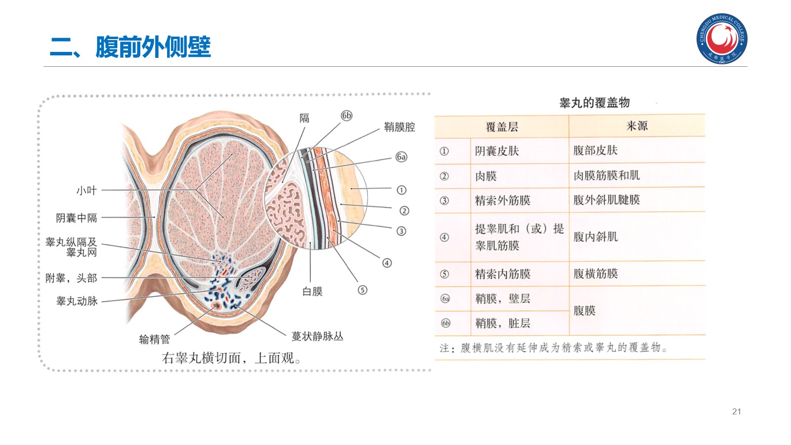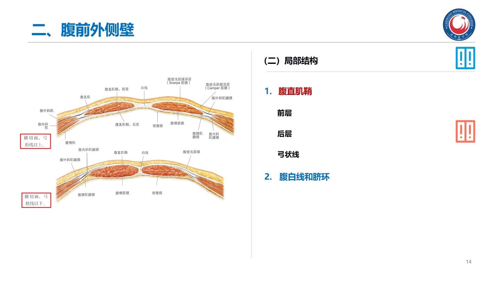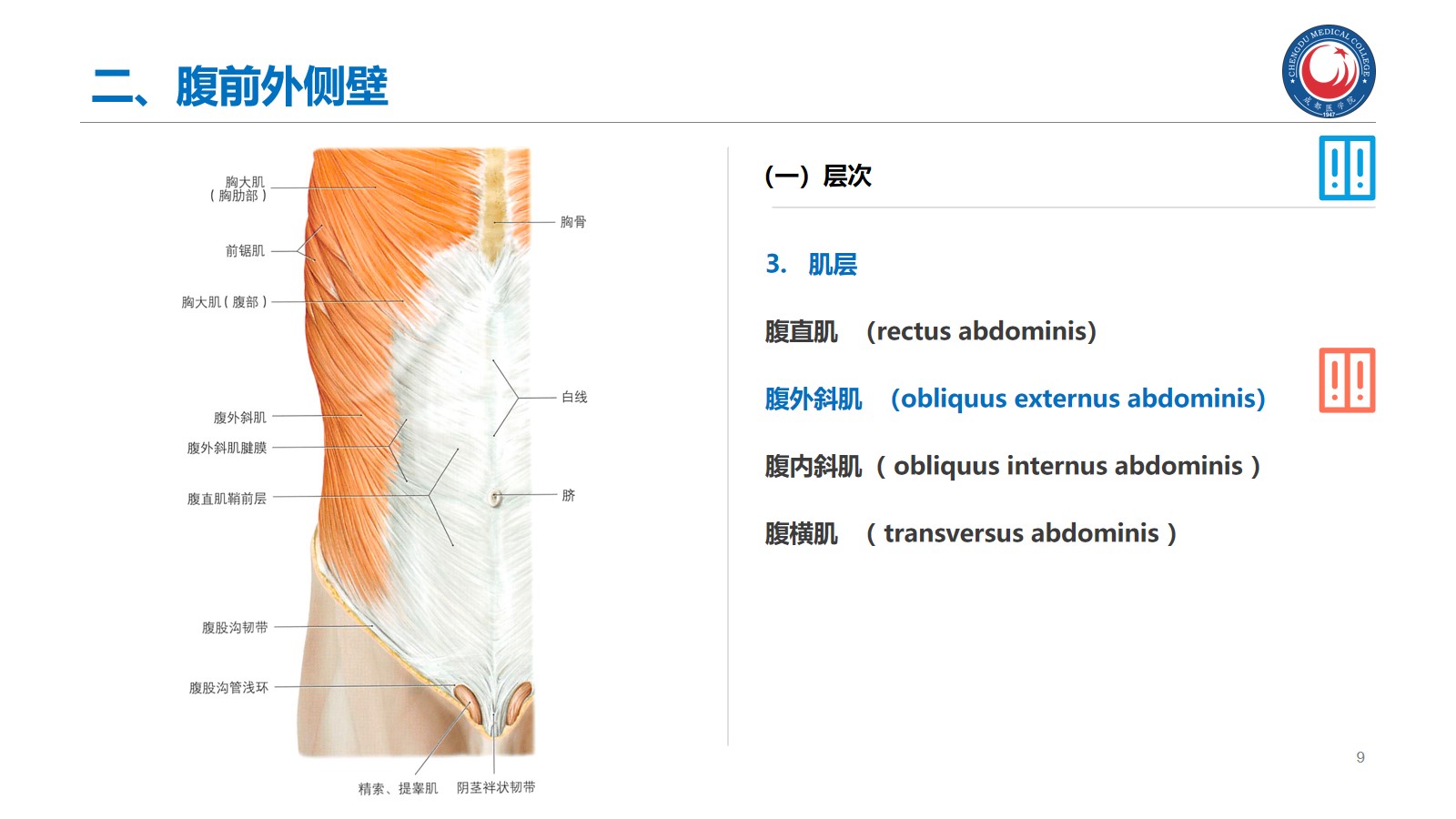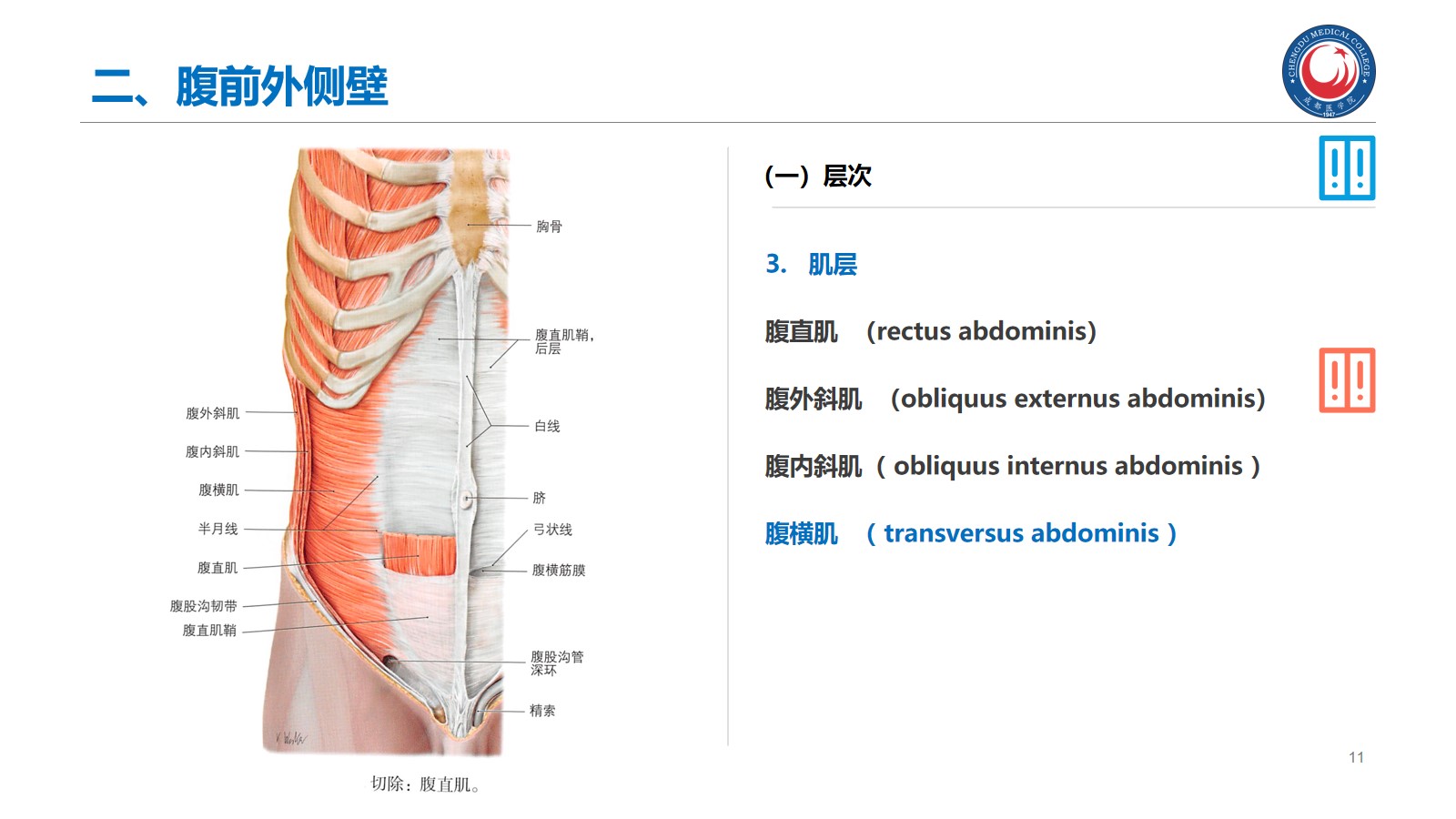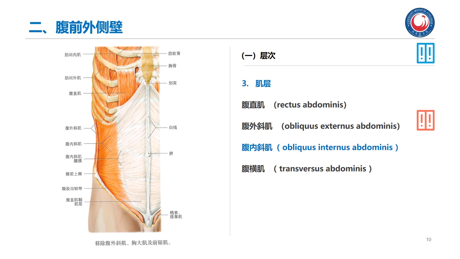 浅筋膜的深方为肌层,是腹前外侧壁的主要结构,其前部由腹直肌鞘前叶、腹直肌及腹直肌鞘后叶组成,其外侧部由腹外斜肌、腹内斜肌和腹横肌组成。