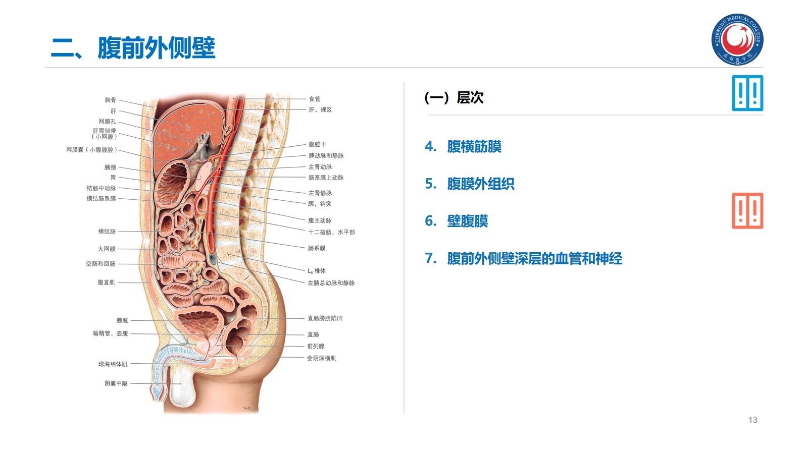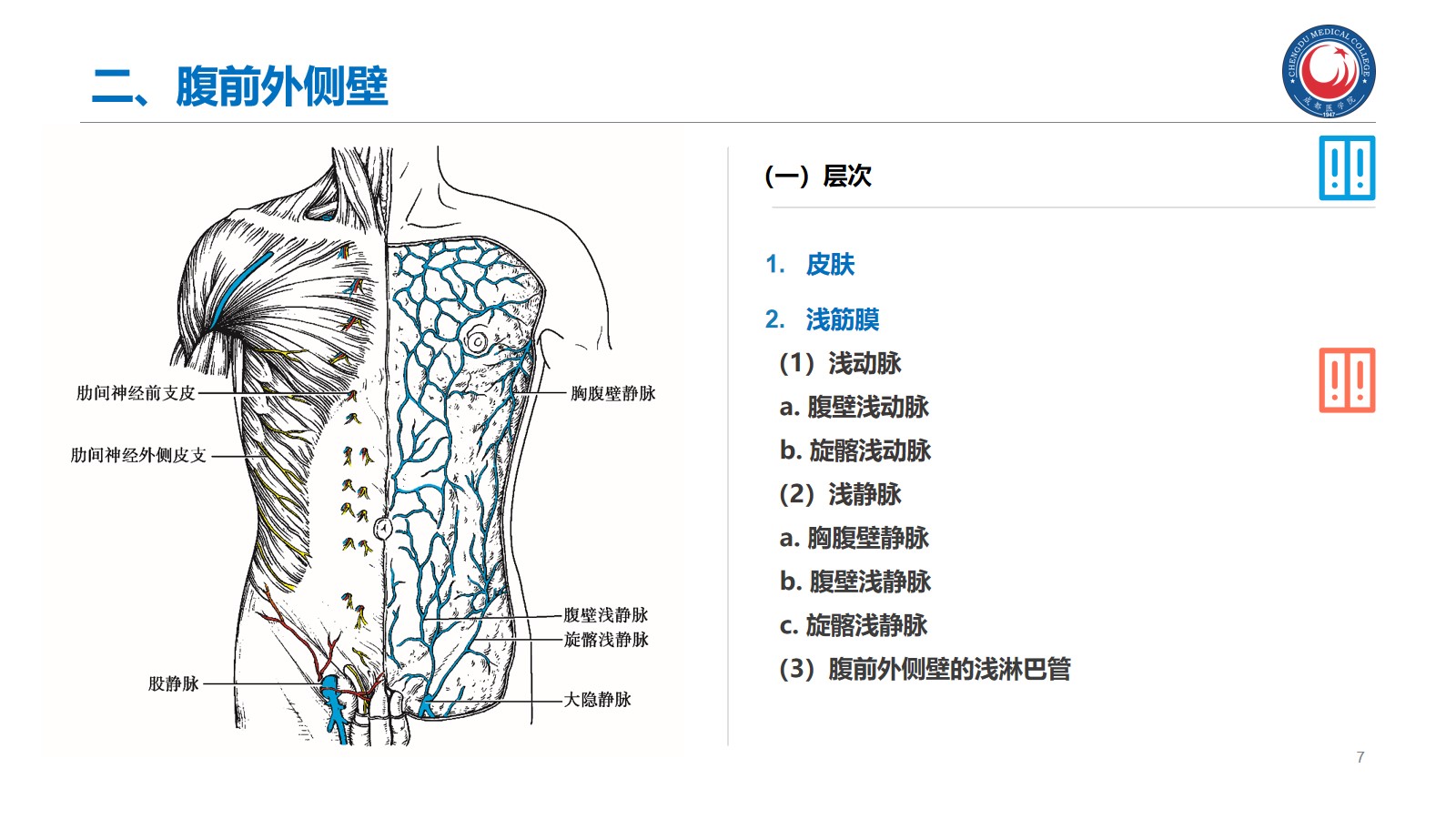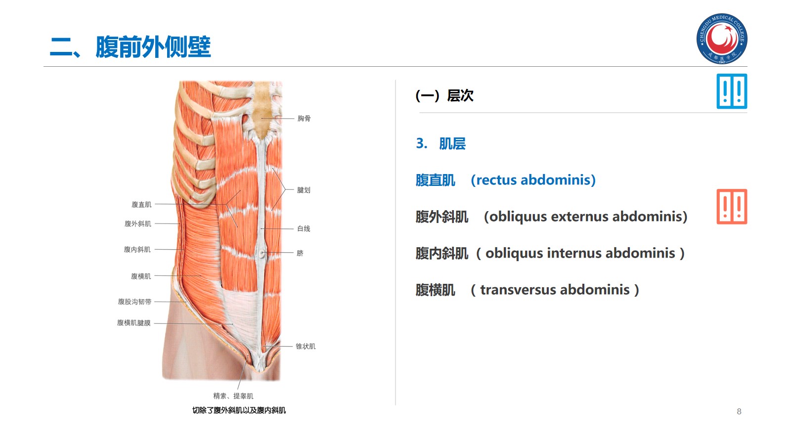 肌层内有丰富的血管和神经,这些血管和神经均行于后两层肌之间腹壁上动脉和腹壁下动脉行于腹直肌与腹直肌鞘后叶之间;下6对胸神经前支及肋间后血管行于腹内斜肌与腹横肌之间;第10 胸神经前支平对脐。这些血管和神经的出现均可提示腹前外侧壁层次和深度。