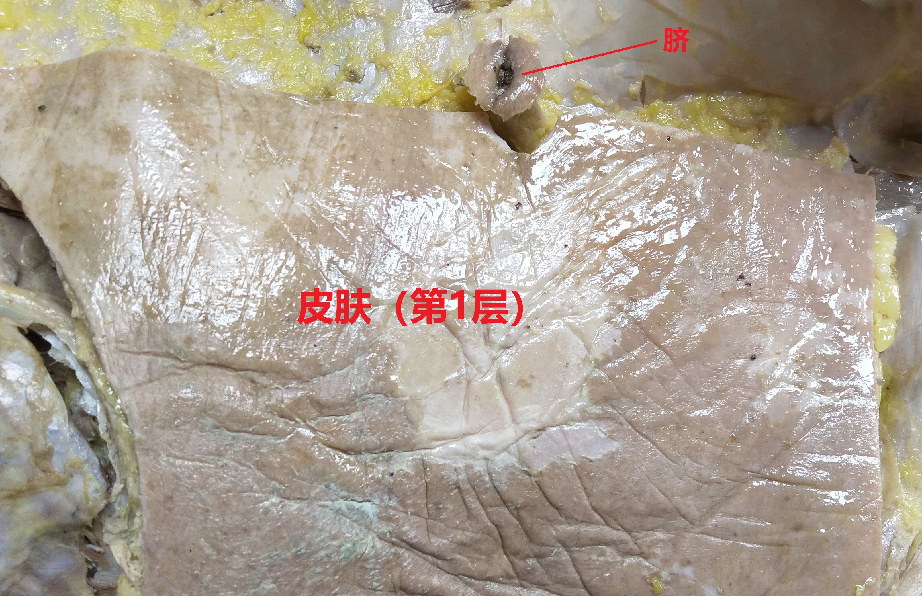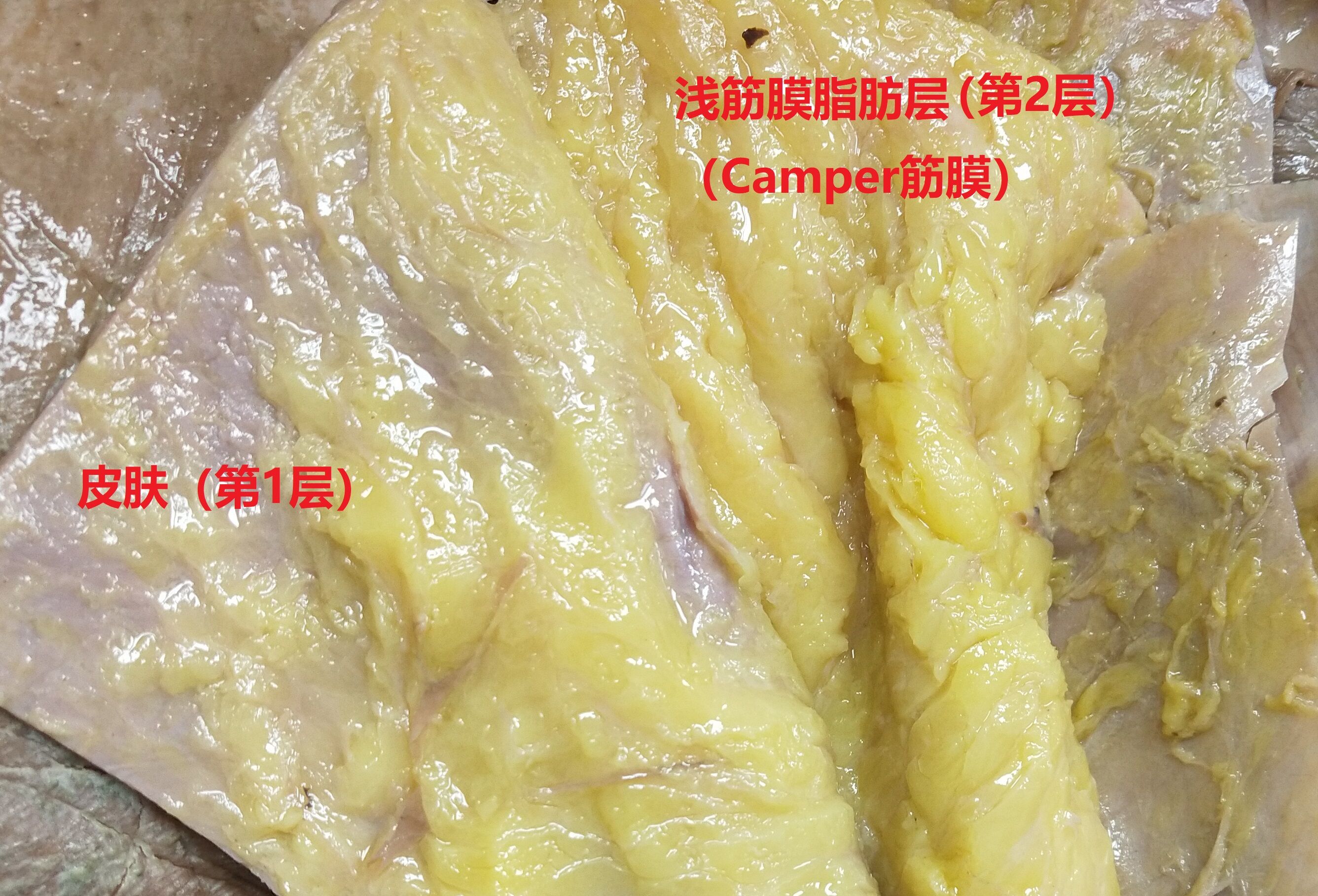 浅筋膜在脐下明显区分为两层,浅层为脂性层,深层为膜性层。膜性层与深方的腹外斜肌腱膜之间结合疏松易分离,并于耻骨结节的内侧与会阴浅间隙及阴囊肉膜相通。