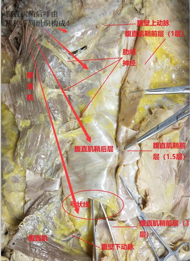 前叶由三层扁肌的腱膜构成,上部最薄由腹外斜肌腱膜一层构成;下部最厚,由腹外斜肌、腹内斜肌和腹横肌三层腱膜构成;中部由腹外斜肌、腹内斜肌二层腱膜构成。