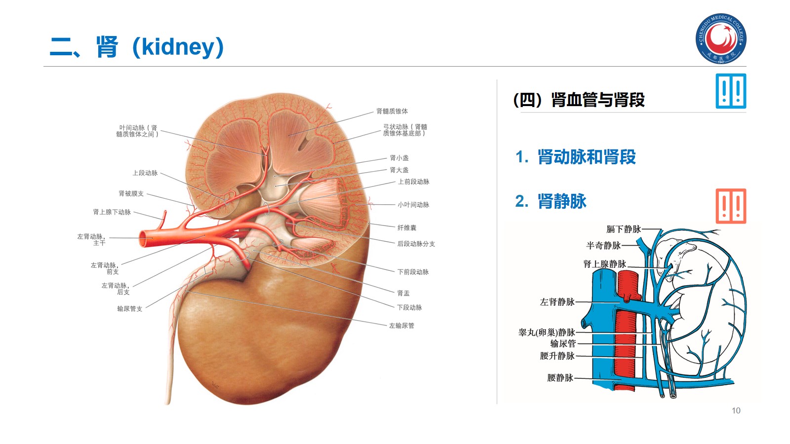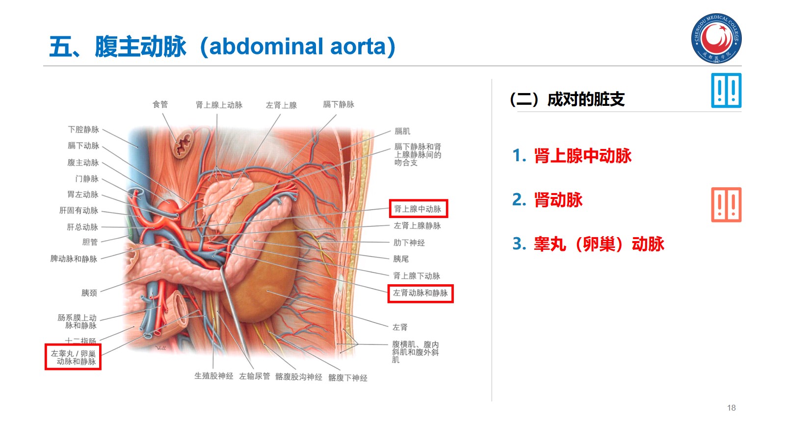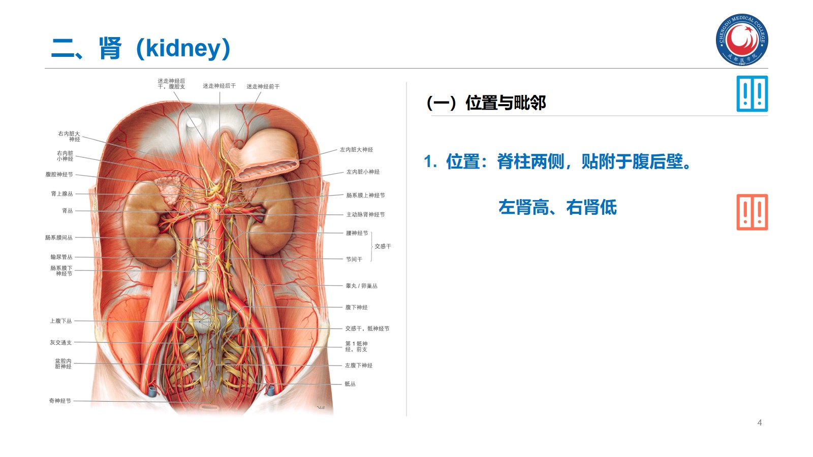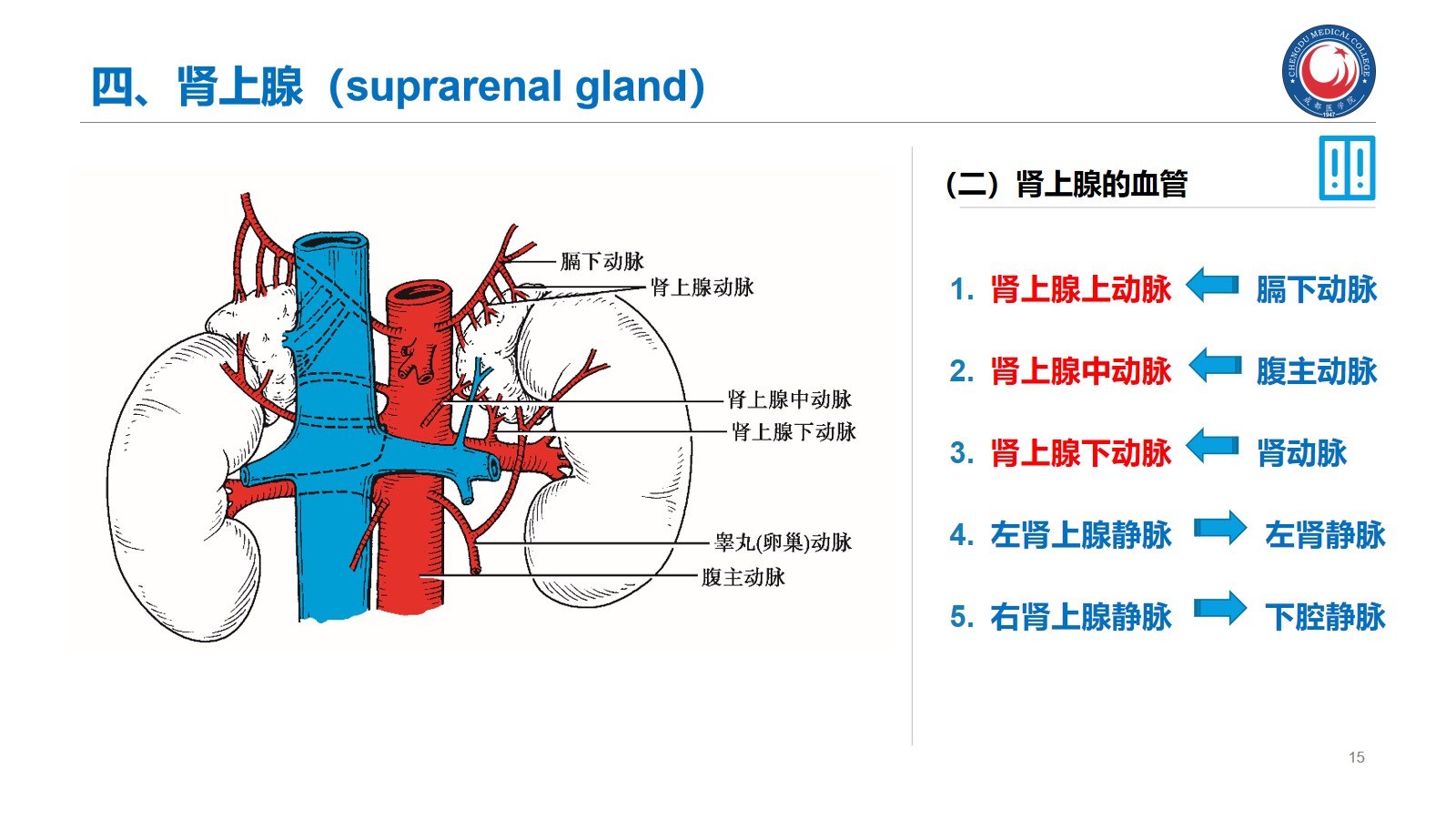 掌握:肾的位置、毗邻及其临床意义;输尿管的行程、狭窄部位以及与输尿管结石的关系。腹腔干、肠系膜上、下动脉、肾动脉、睾丸动脉的起始、行径和分支分布。下腔静脉的位置、肾静脉、睾丸静脉的行径和注入部位。