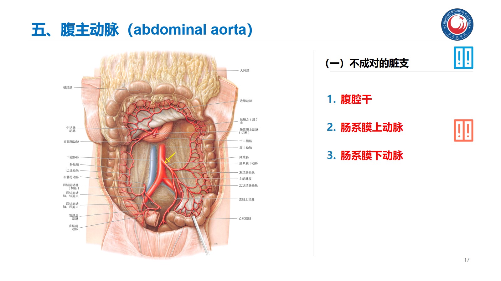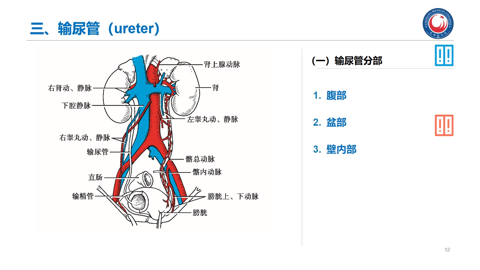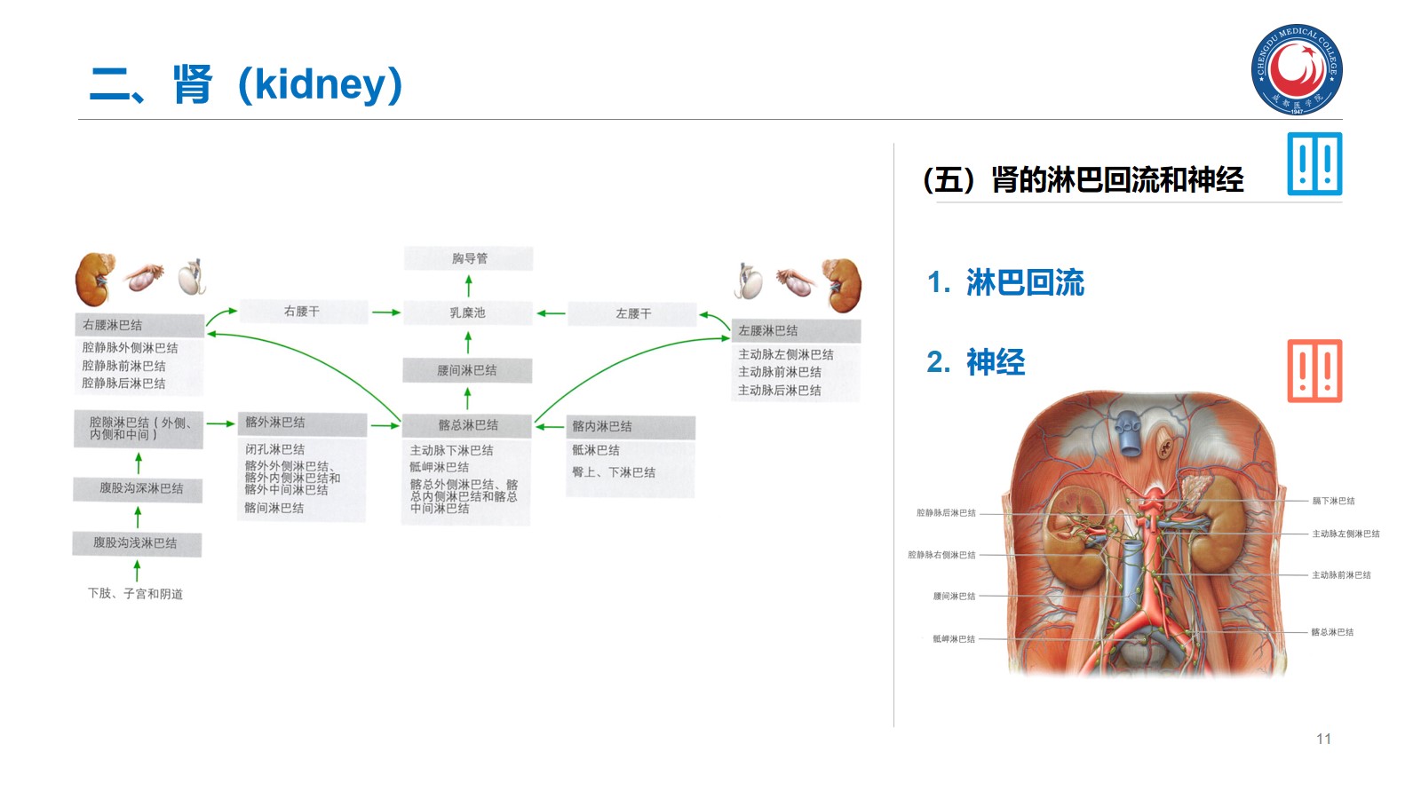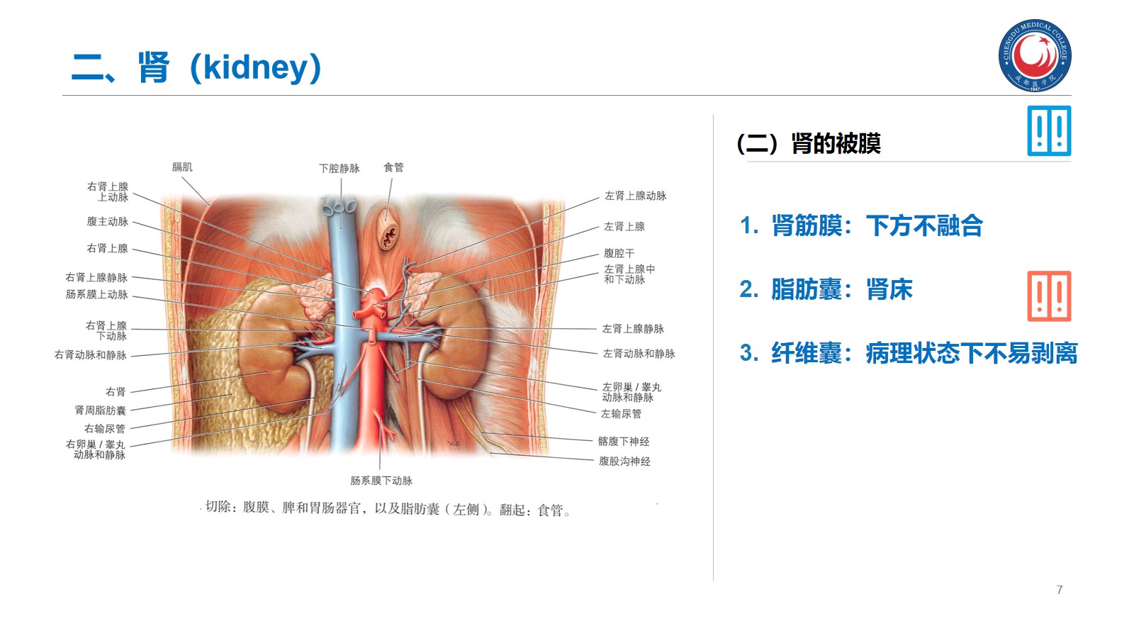 掌握:肾的位置、毗邻及其临床意义;输尿管的行程、狭窄部位以及与输尿管结石的关系。腹腔干、肠系膜上、下动脉、肾动脉、睾丸动脉的起始、行径和分支分布。下腔静脉的位置、肾静脉、睾丸静脉的行径和注入部位。