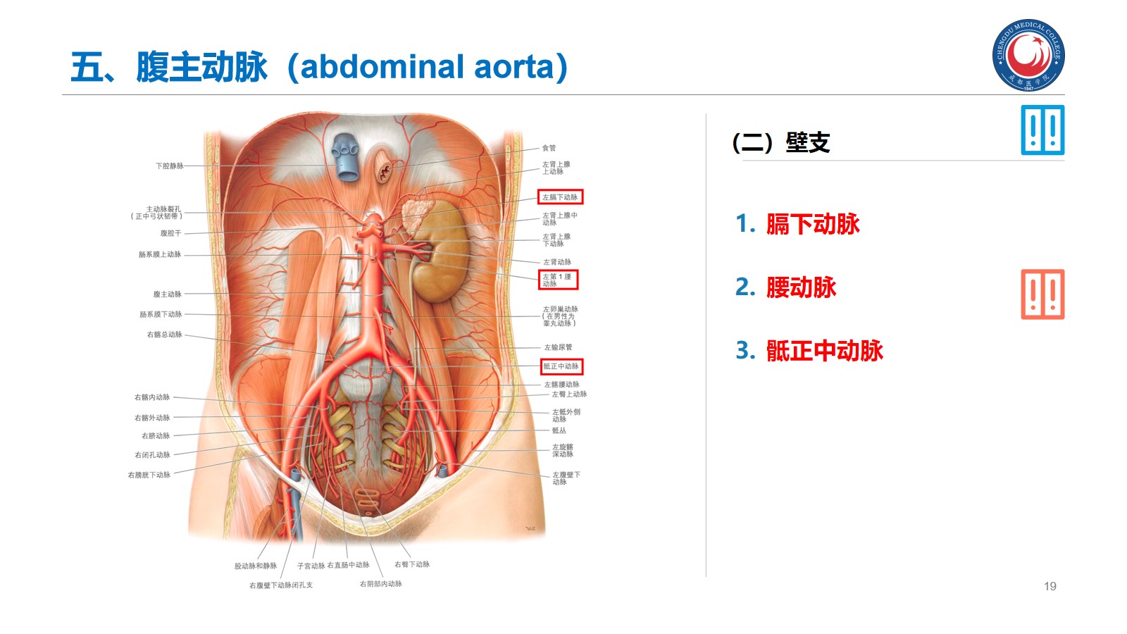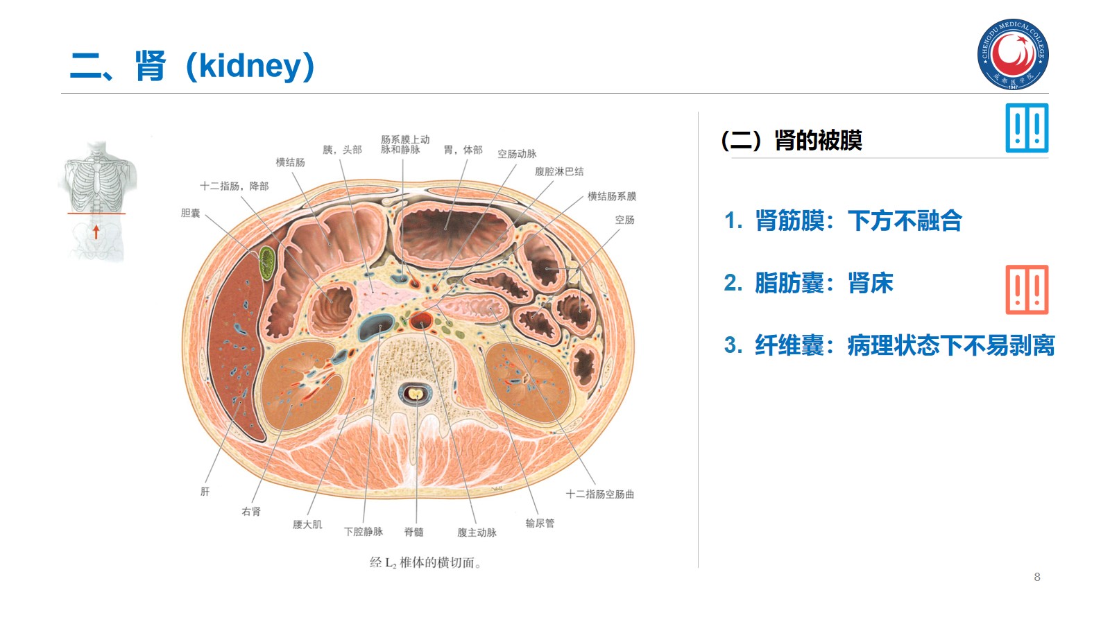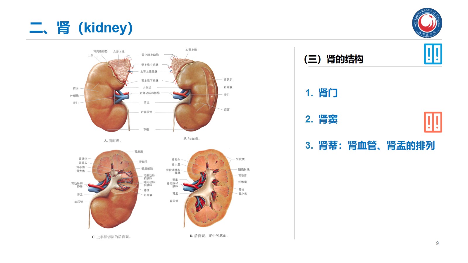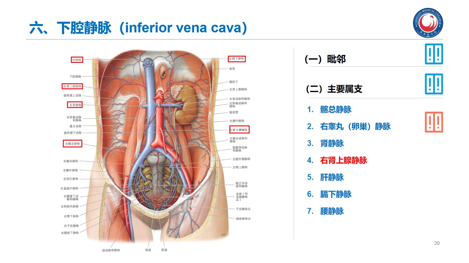 掌握:肾的位置、毗邻及其临床意义;输尿管的行程、狭窄部位以及与输尿管结石的关系。腹腔干、肠系膜上、下动脉、肾动脉、睾丸动脉的起始、行径和分支分布。下腔静脉的位置、肾静脉、睾丸静脉的行径和注入部位。