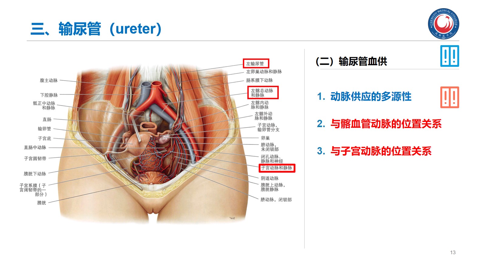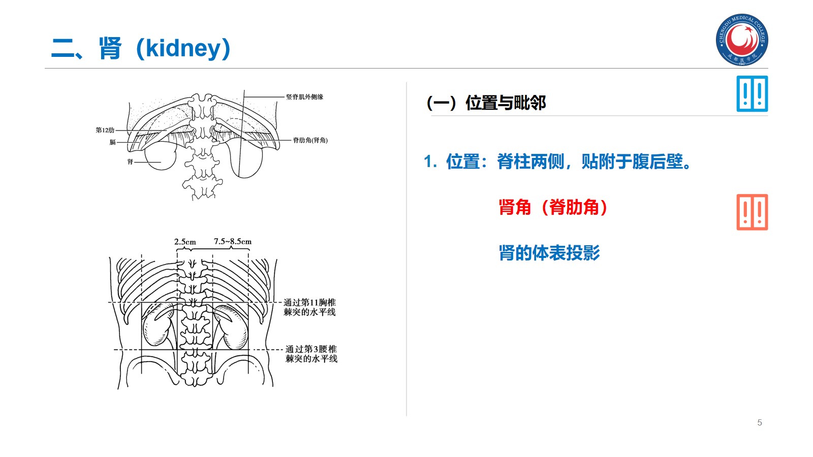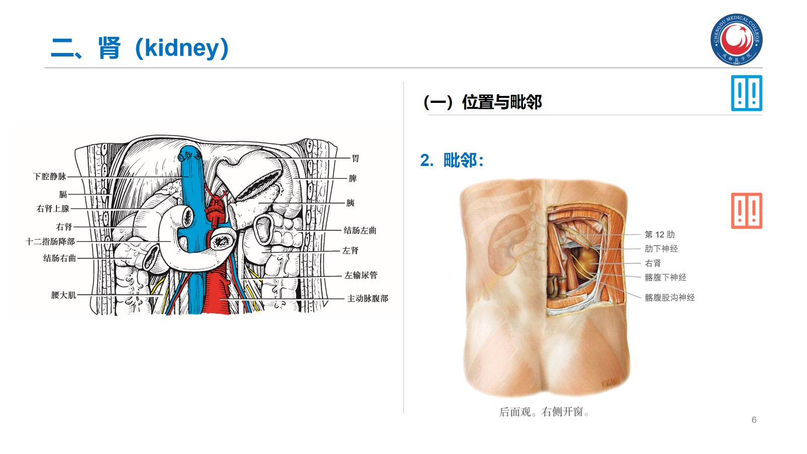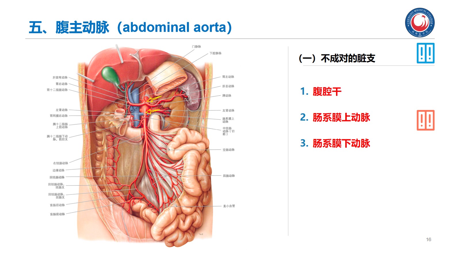 掌握:肾的位置、毗邻及其临床意义;输尿管的行程、狭窄部位以及与输尿管结石的关系。腹腔干、肠系膜上、下动脉、肾动脉、睾丸动脉的起始、行径和分支分布。下腔静脉的位置、肾静脉、睾丸静脉的行径和注入部位。