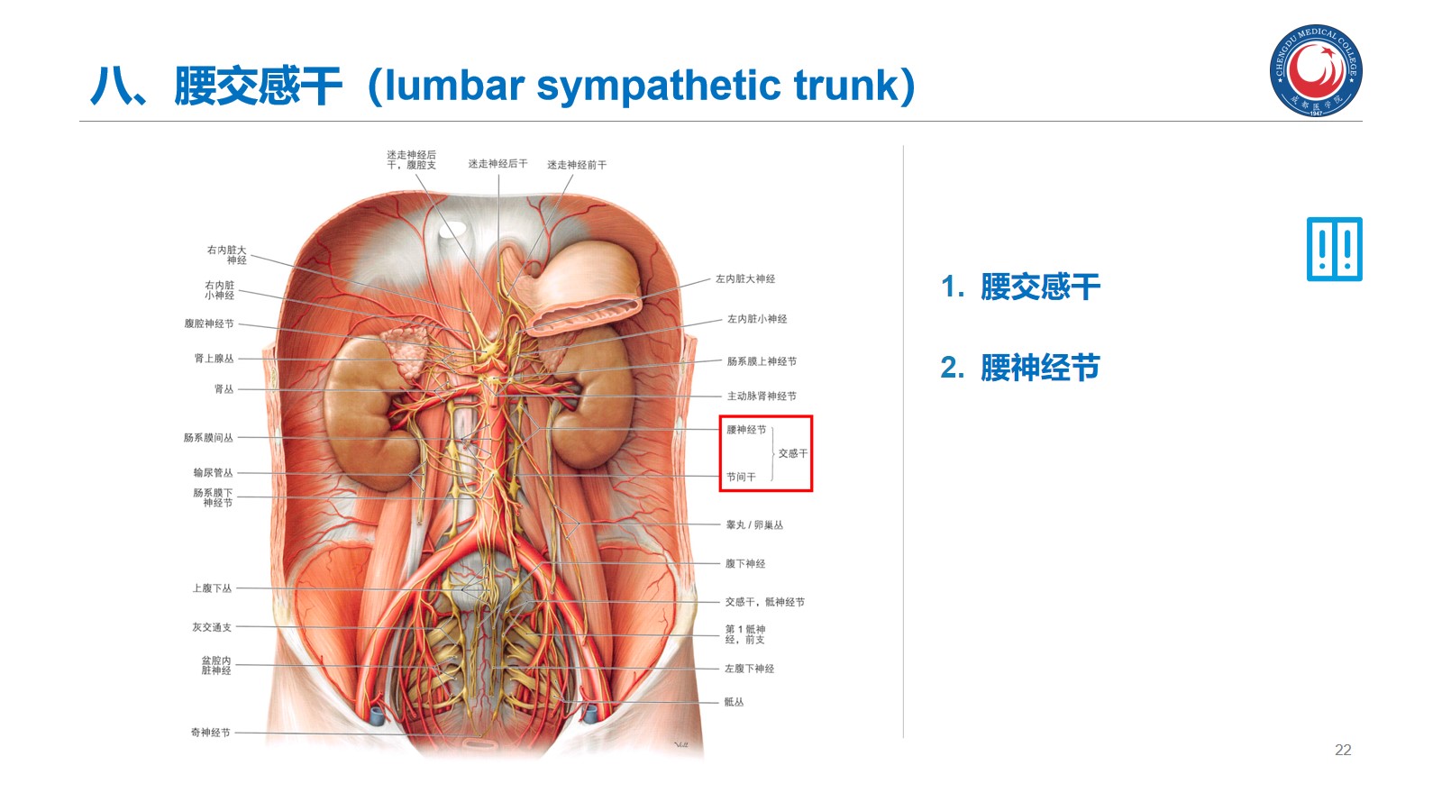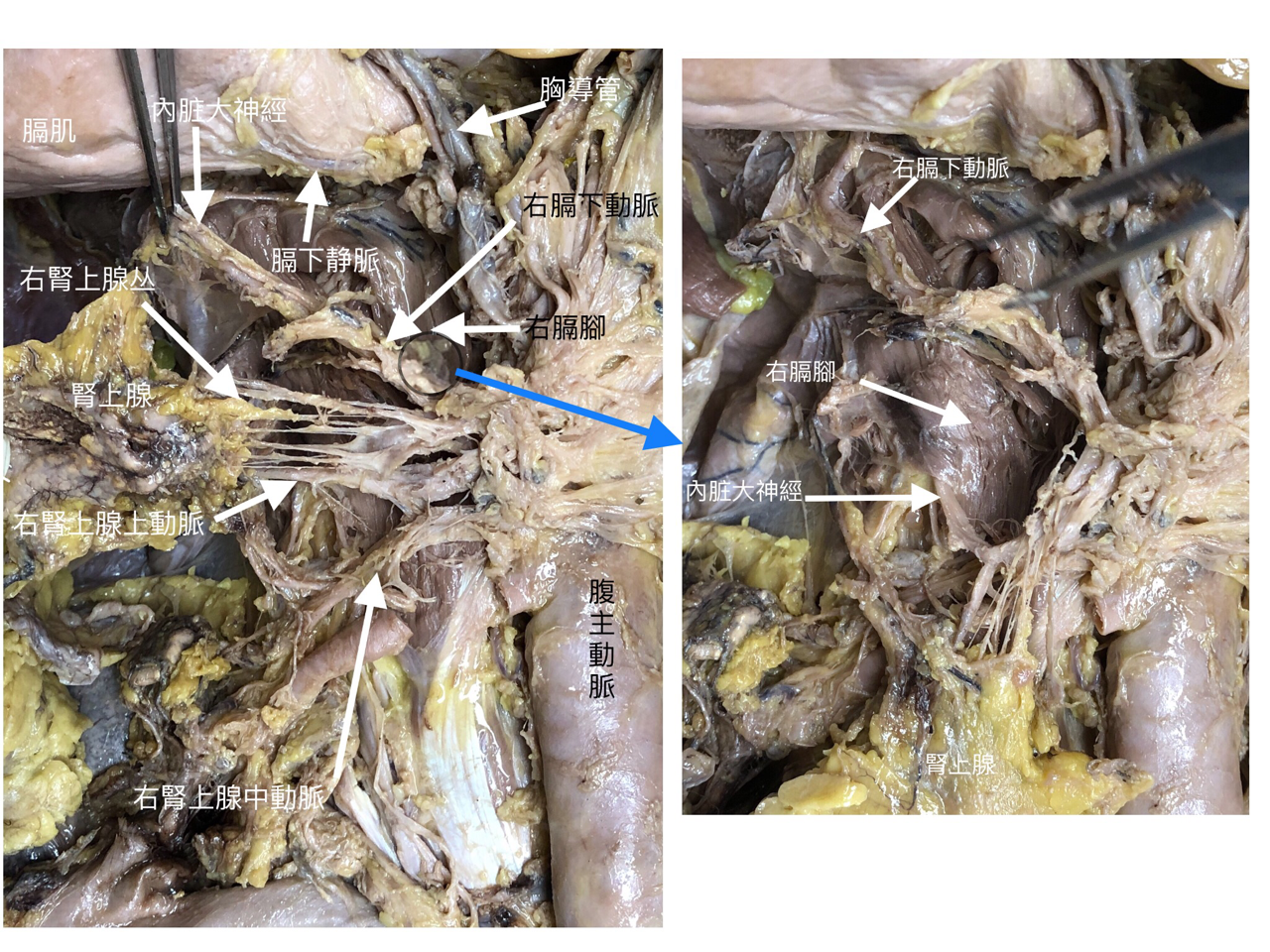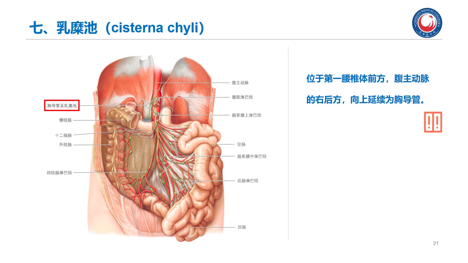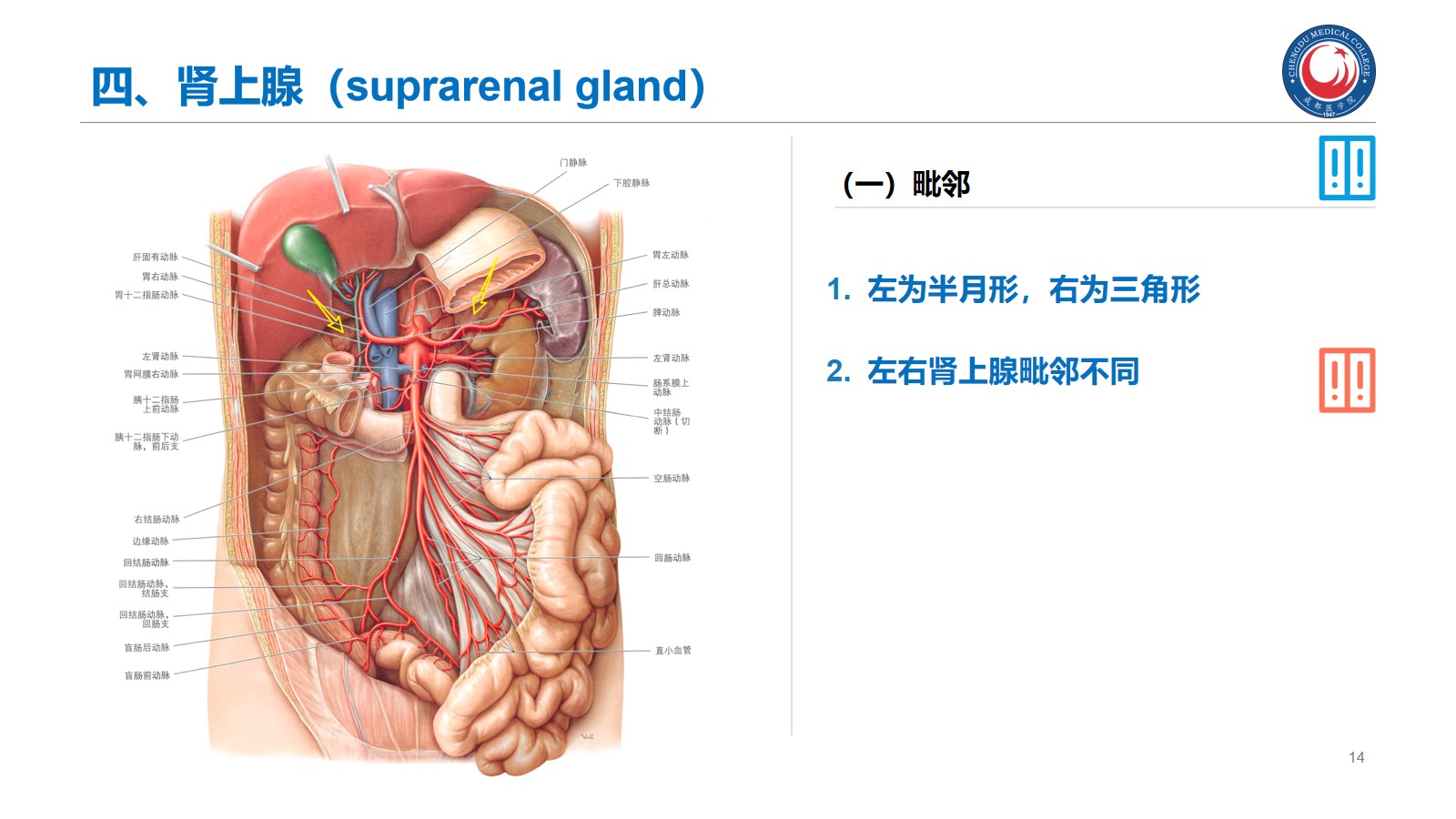 熟悉:胰腺的位置、分部和各部的毗邻;肾上腺的形态和位置。腰交感干和乳糜池的位置。